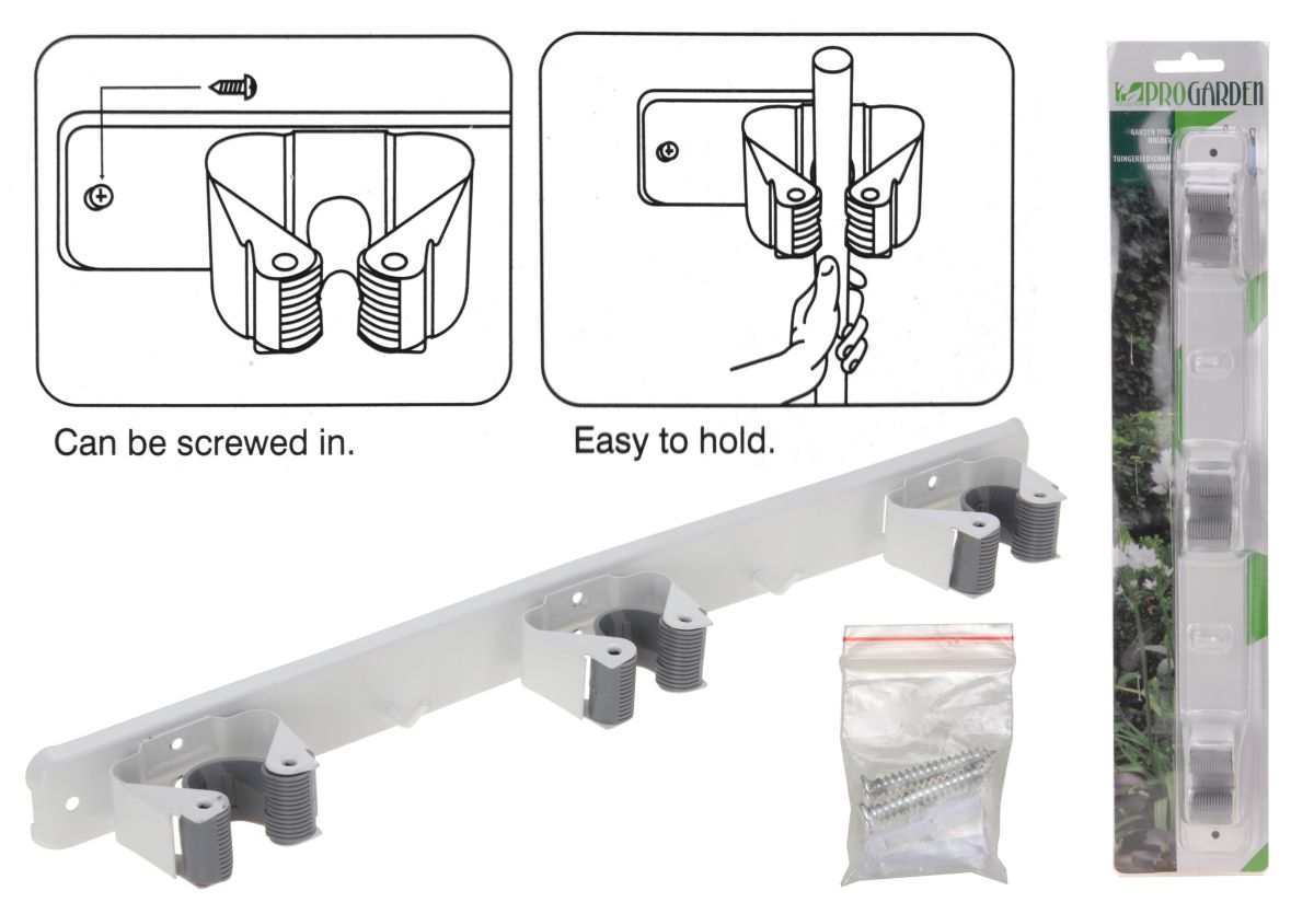 Tre hållare och två krokar. Håller alla trädgårdsredskap med ett handtag.