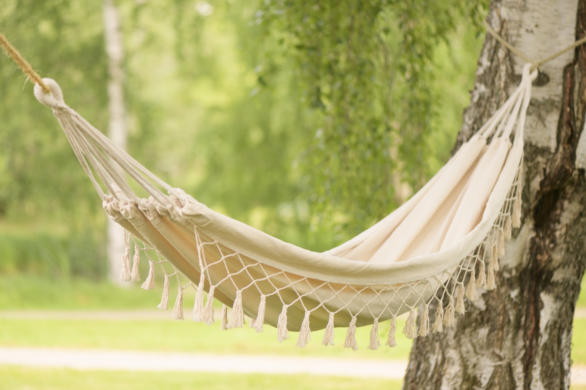 Den snygga benvita hängmattan är tillverkad av en hållbar och mjuk bomullsblandning av polyester. Hängmattan är den mest trafikerade platsen på sommaren.