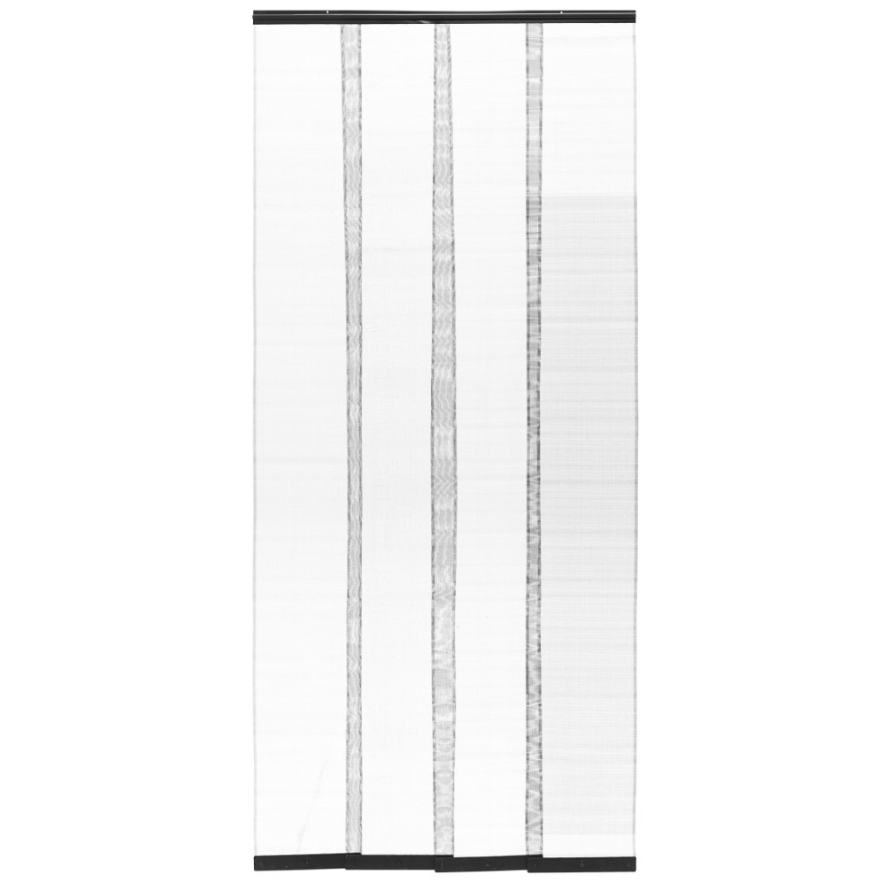 En dörrgardin bestående av fyra breda remsor av insektsnät. Listerna fästs på en plastlist, som monteras på dörrens övre karm eller list. Storleken kan reduceras till både kortare och smalare vid behov.