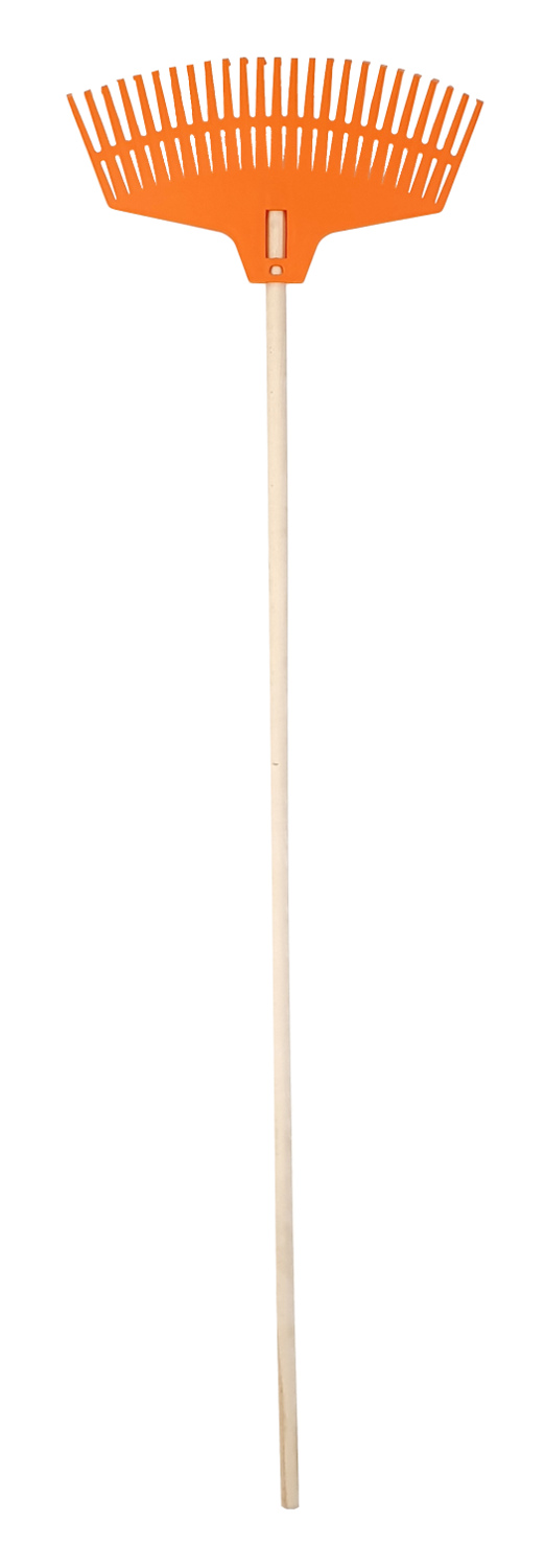En traditionell lövkratta med ett bågat plastblad. Skaft i trä. Lövkrattans pinnar är något flexibla, så löv och annat skräp krattas effektivt men skonsamt.
