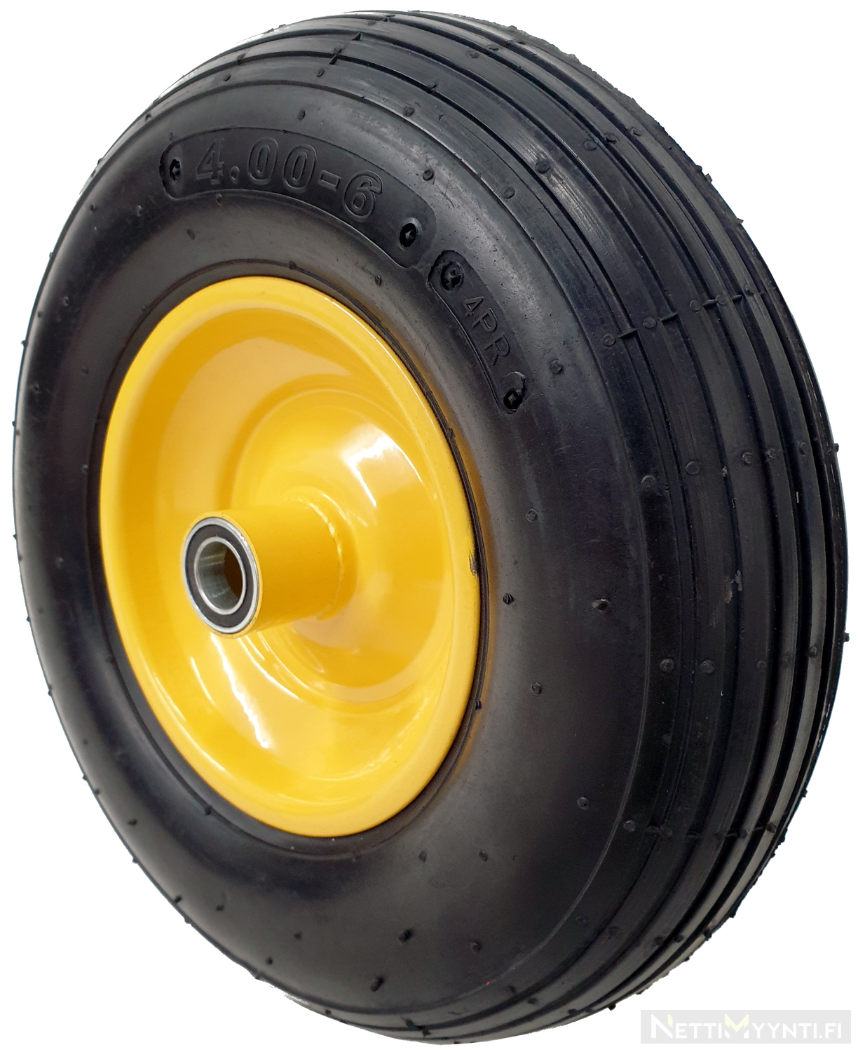 Grundmodell pneumatiskt hjul. 20 mm axel, med kullager. Gul metallkant.