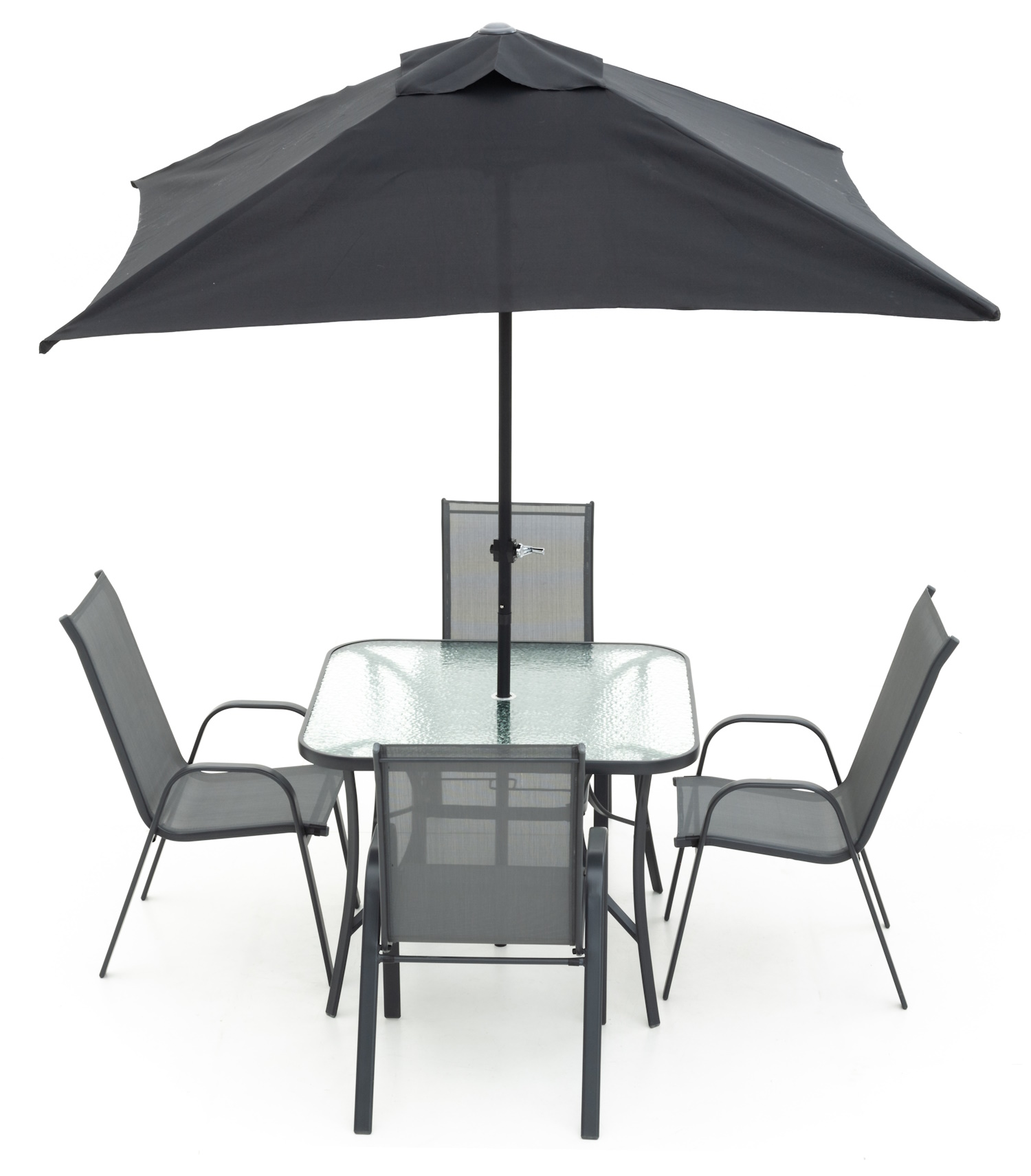 Snygga trädgårdsmöbler för fyra personer. I utrustningen ingår fyra stapelbara stolar, vars sits och rygg är gjorda av slitstarkt textilene 2 x 1 tyg, bordet är tillverkat av härdat 5 mm korrugerat glas och ett rektangulärt parasoll. Stålramsutrustning är ett hållbart val för trädgården.