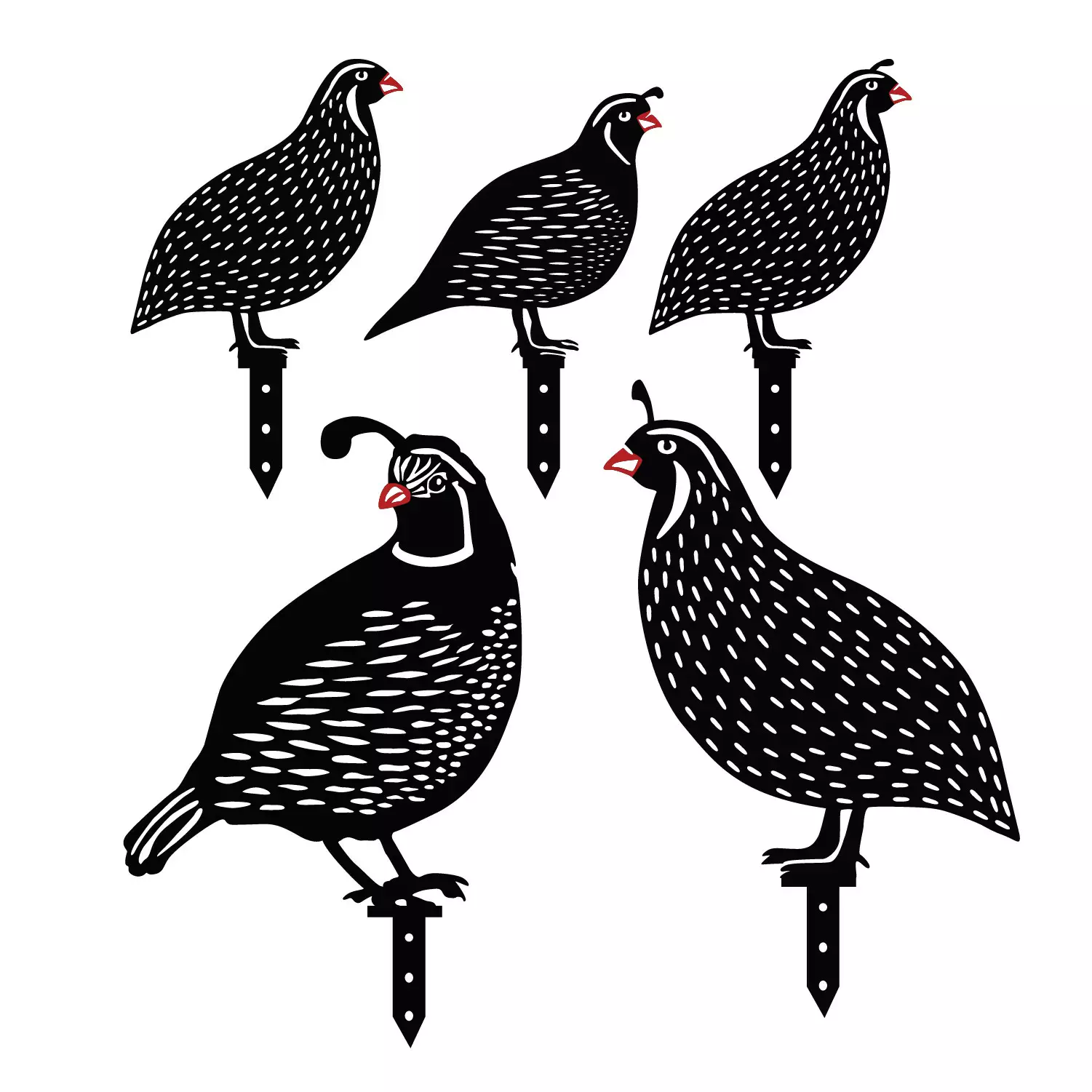 Vaktelfamiljen som ingår i detta set är helt enkelt oemotståndlig. De större vaktlarna, som mäter 20 x 24 cm och 21 x 25 cm, gör ett djärvt uttalande och blir fokuspunkten i din trädgård. De mindre vaktlarna, som mäter 13 x 15 cm och 15 x 13 cm, tillför en touch av nyckfullhet och lekfullhet till varje hörn.