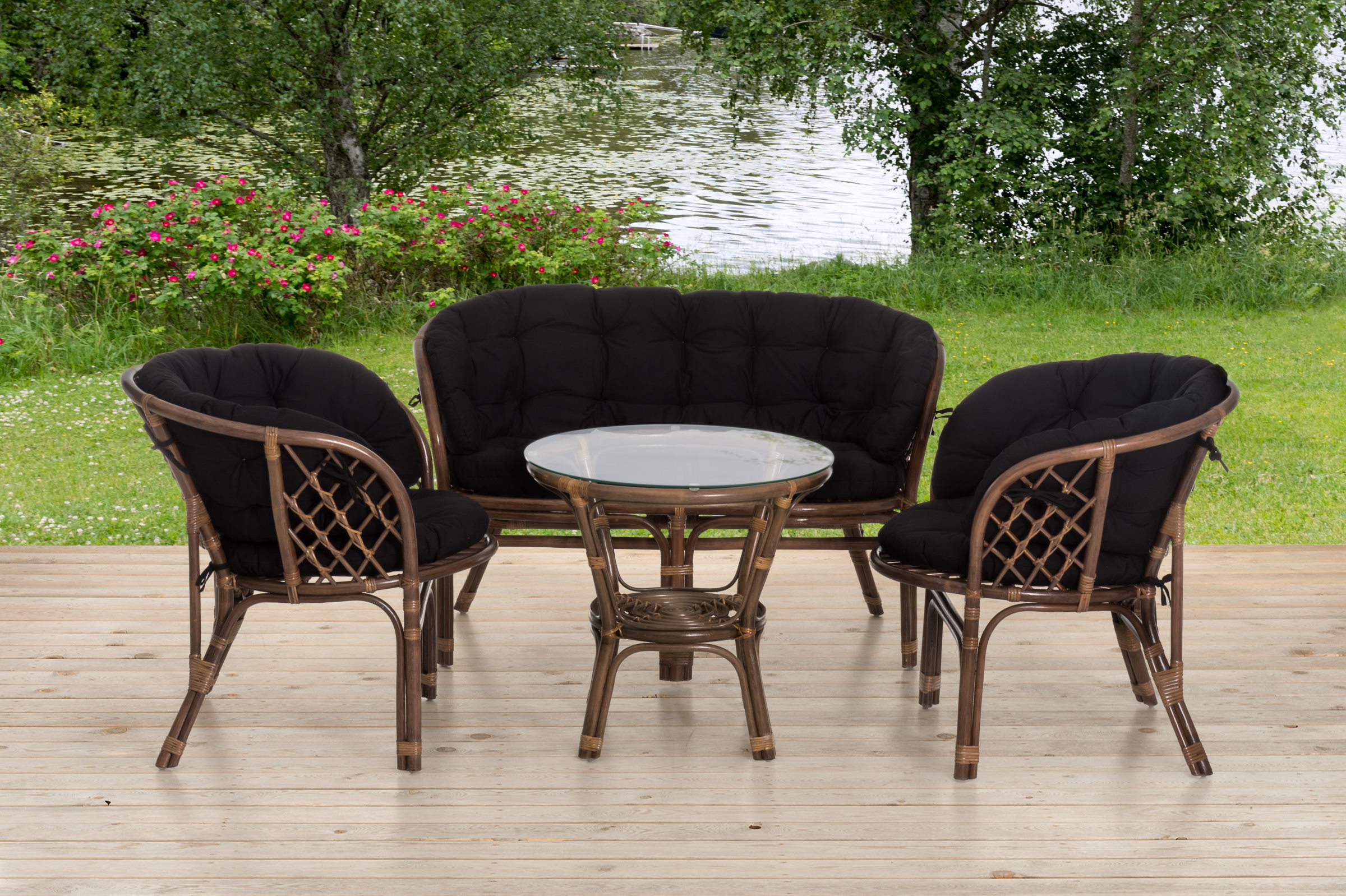Mörkbrun rotting är perfekt för både utomhus- och inomhusutrymmen. De svarta kuddarna och bågarnas bruna toner är iögonfallande och ser snygga ut länge. En vacker sittgrupp inbjuder dig att koppla av. I loungegruppen ingår en vackert designad tvåsitssoffa, två stolar och ett litet bord med glasskiva. Rottingmöbler är lätta, hållbara och tål temperaturfluktuationer bra, men fukt bör inte samlas på möbelytan. Rottingmöbler håller länge, framför allt inomhus, på inglasade/täckta terrasser och balkonger, men passar utmärkt för utomhusbruk, då de är lätta att hantera och lyfta i lä.
