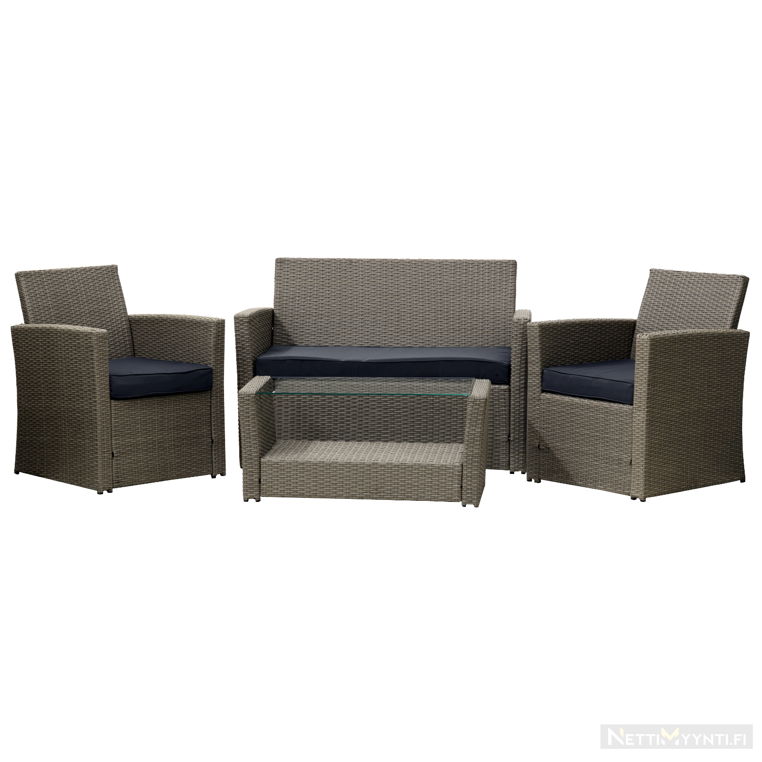 Vackra, hållbara och stilrena konstrottning möbelgrupp. Dynor ingår. På bordet finns ett glas som ger ett snyggt intryck. Möblerna är mörkgrå.