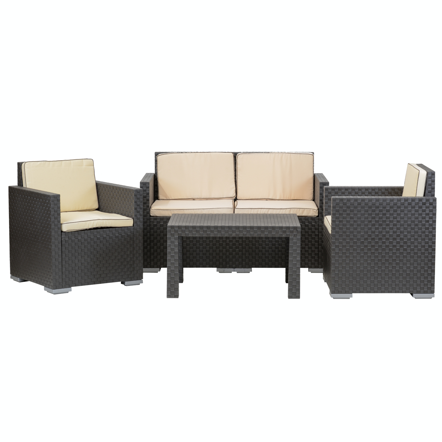 En snygg möbelgrupp med två stolar, en soffa och bord. Möbelgruppen är tillverkat i plast och klarar av alla väder, praktiskt att tvätta med högtryckstvätt (ej dynorna). Möbelgruppen är enkel att monter (klick i system) och kan göras av 1 person.