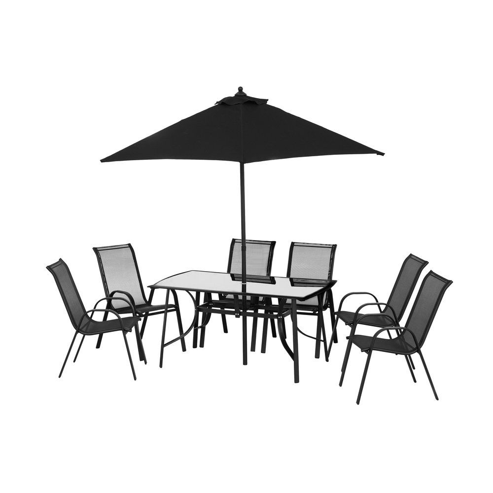 Förnya utseendet på din trädgård med den eleganta möbelgruppen Oxford! Ett 6-sits bord kan rymma en större grupp på en gång. Stolarna i gruppen har svart stålstomme och vacker svart textilklädsel. I loungegruppen ingår sex stolar, ett bord och ett parasoll.