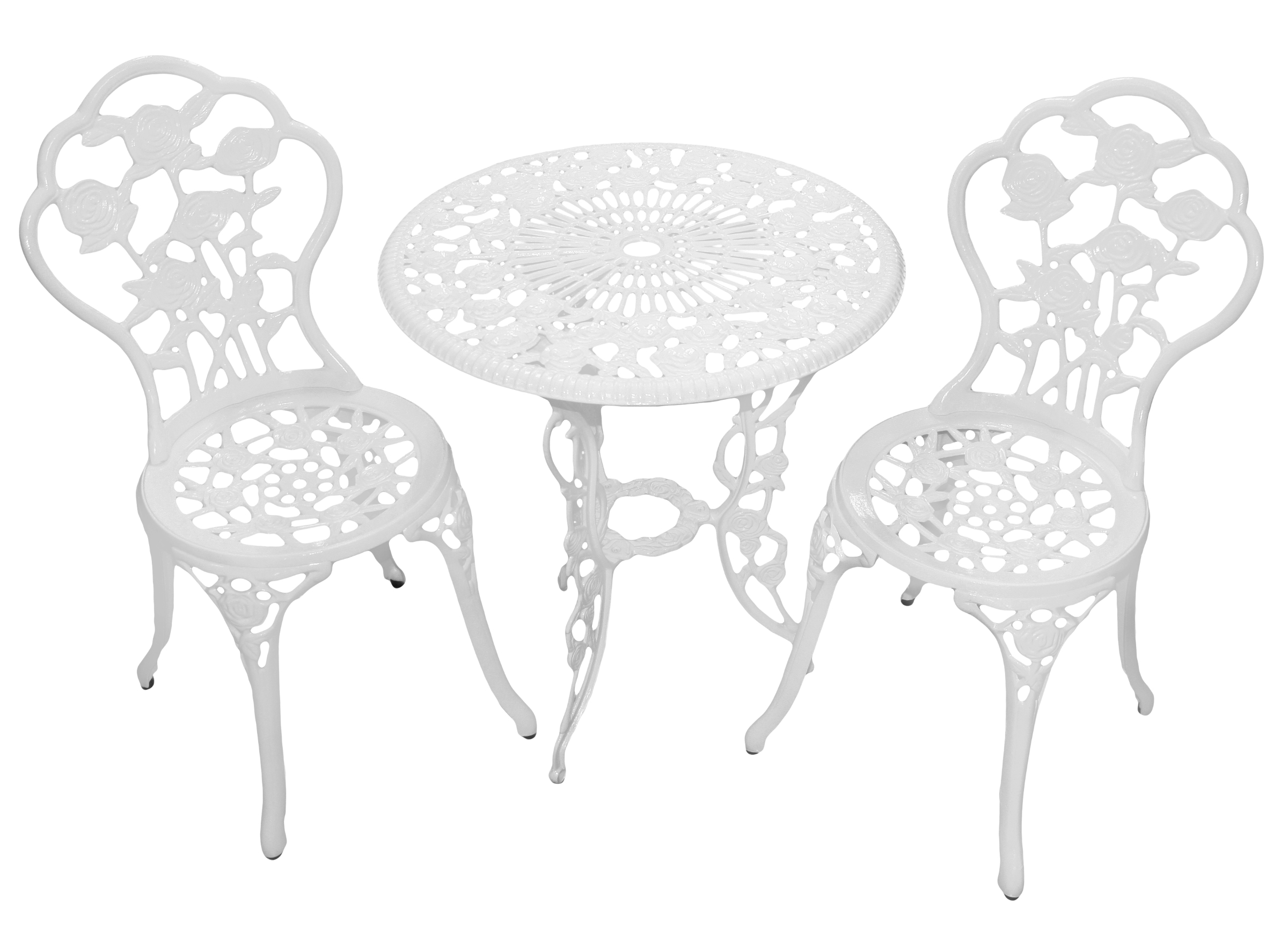 Ett vackert, hållbart och dekorativt balkongset för en sommarvistelse på balkongen, terrassen, uteplatsen eller till och med på bryggan. Setet innehåller ett bord och två stolar. Bordsskivan och stolarnas ryggstöd är tillverkade av väderbeständig gjuten aluminium, övriga delar är av gjutjärn.