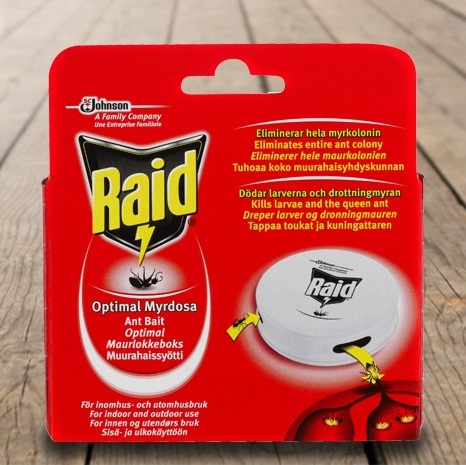 Nya myrdosan från Raid är en effektiv metod mot myror inomhus, på balkongen och terrassen, året runt.