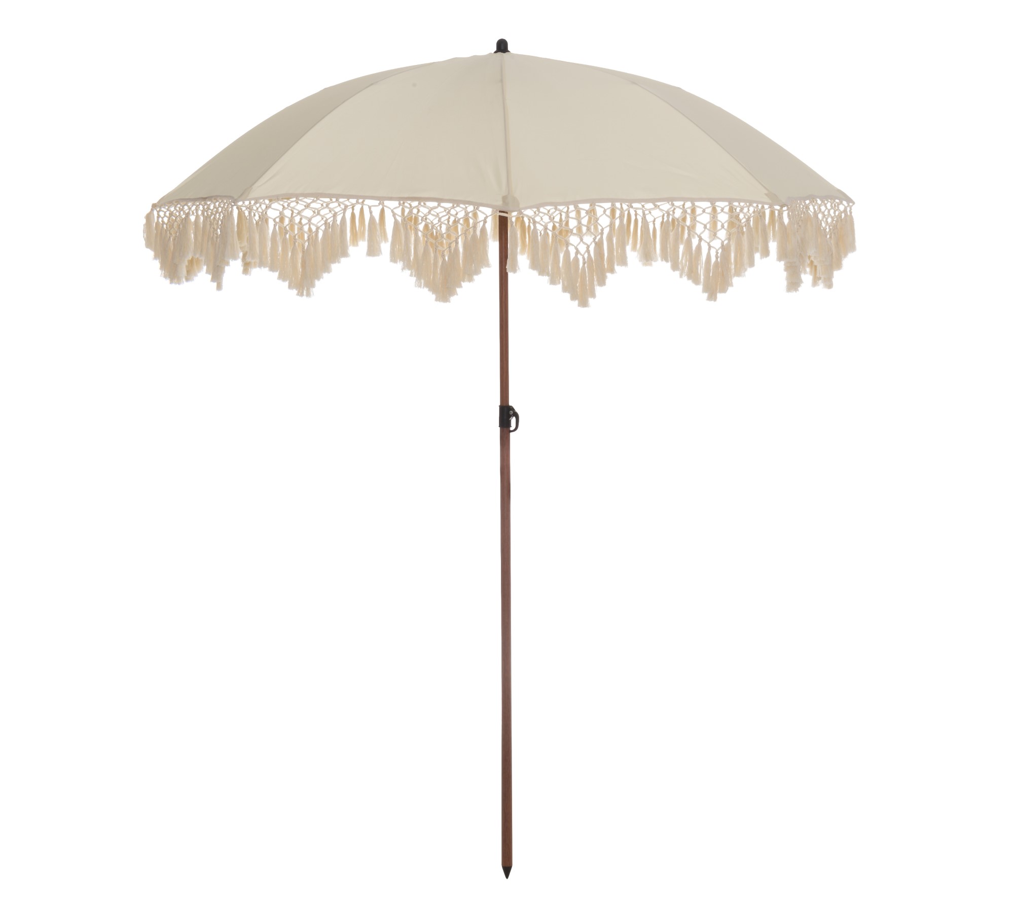 Det snygga parasollet har vackra makrame dekorativa fransar och metalldelarna är behandlade för att se ut som trä, vilket ger skuggan en underbar naturlig look.
