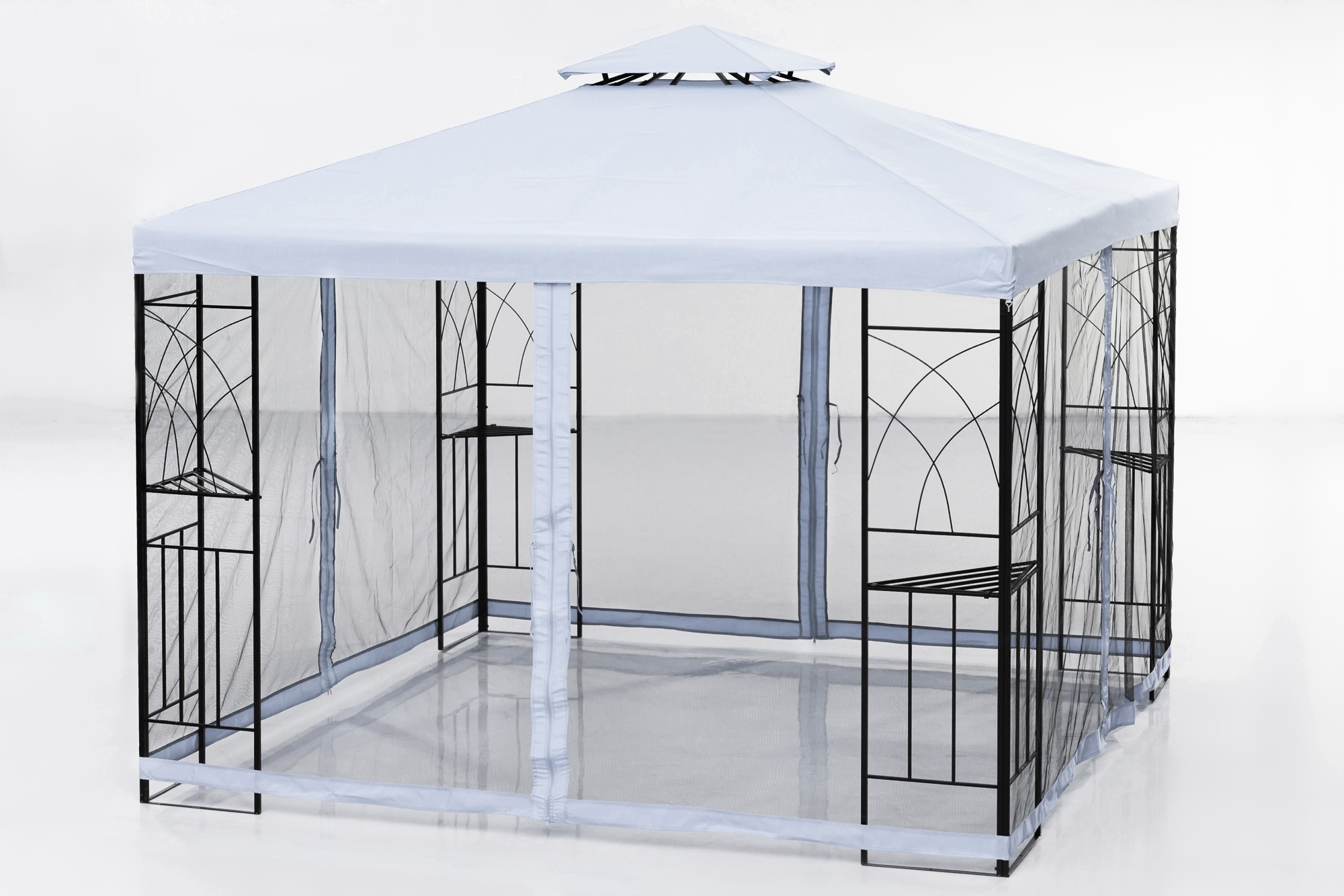 Barcelona är en graciös och vacker paviljong i trädgården. Utmärkt för både sommarfester och sommarliv. Fuktskyddande soltak med svart pulverlackerad stålram. PA-belagd polyesterbeläggning med en tjocklek på 160g / m². Höjningen i mitten av paviljongen ger behaglig luftighet, och de svarta myggnäten håller de oinbjudna insekterna utanför paviljongen. Hörnen har hyllnivåer där det är lätt att placera, till exempel blommor.