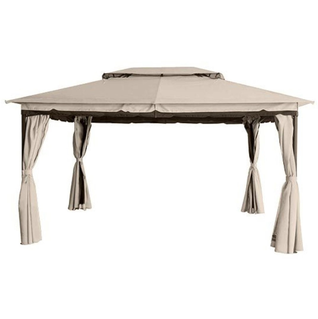Magnifik Garda-paviljong, färg beige. Förnyad modell, storlek 4 x 3 m. Kraftiga rör 40 x 40 mm. Tyg 180 g vattentät polyester. Öppningsbara myggnät och tygväggar på alla sidor.