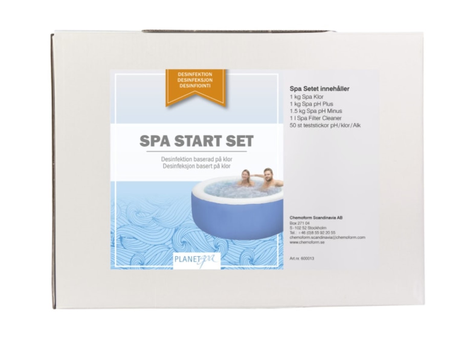 Ett heltäckande startpaket för behandling och rengöring av bubbelpoolvatten. Innehåller en bruksanvisning för vattenbehandling och poolunderhåll, nödvändiga kemikalier, en dispenser och teststickor.