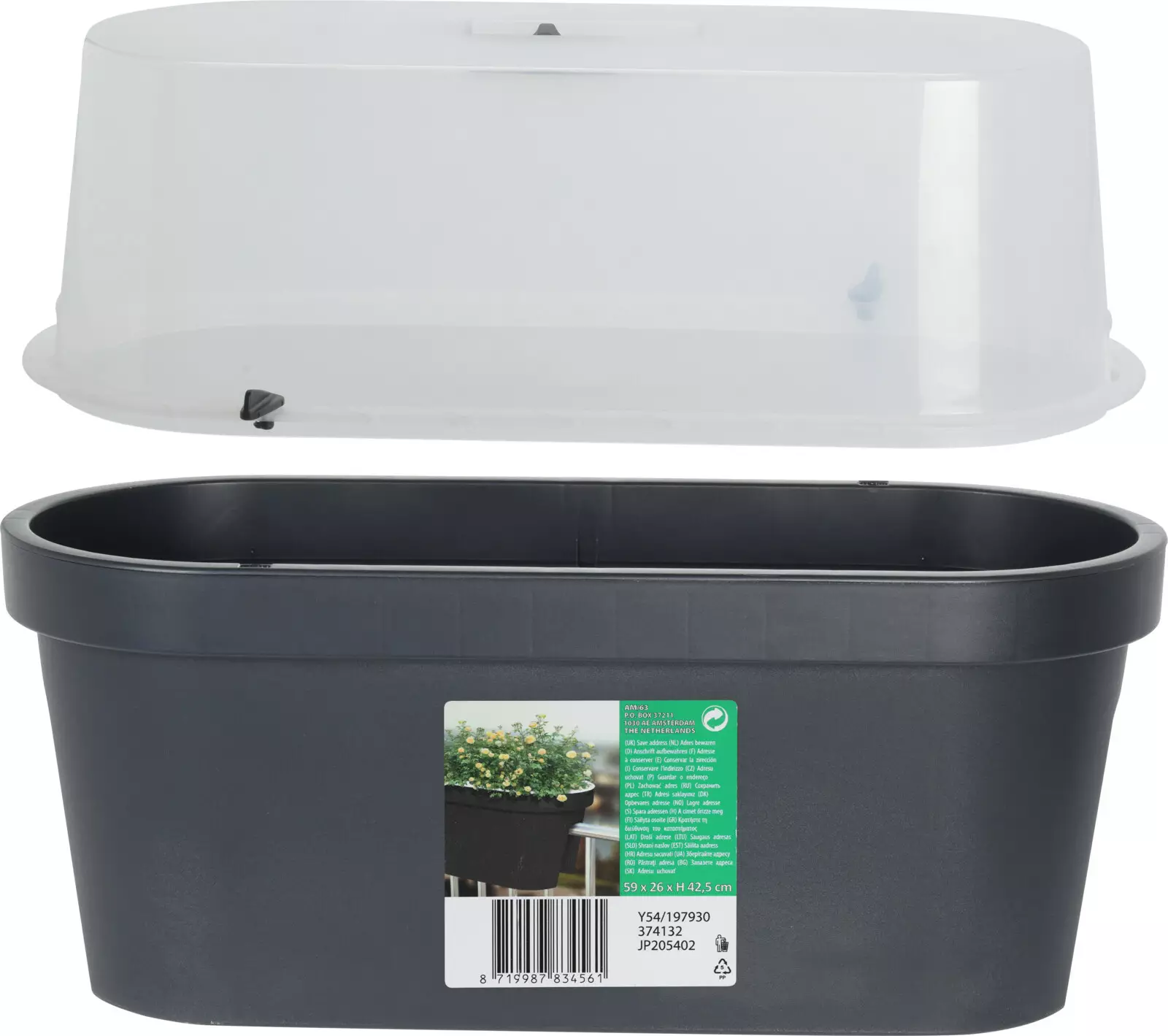 Ge dina växter bästa möjliga start med denna rymliga blomlåda i antracitgrå plast, komplett med ett högt, genomskinligt lock. Perfekt för dig som vill odla kryddor, sallad, blommor eller sticklingar på balkongen, uteplatsen eller i fönstret – tidigt på säsongen eller när vädret växlar. Locket fungerar som ett miniväxthus och skapar ett skyddat mikroklimat som både påskyndar groning och skyddar små plantor mot kyla och vind.