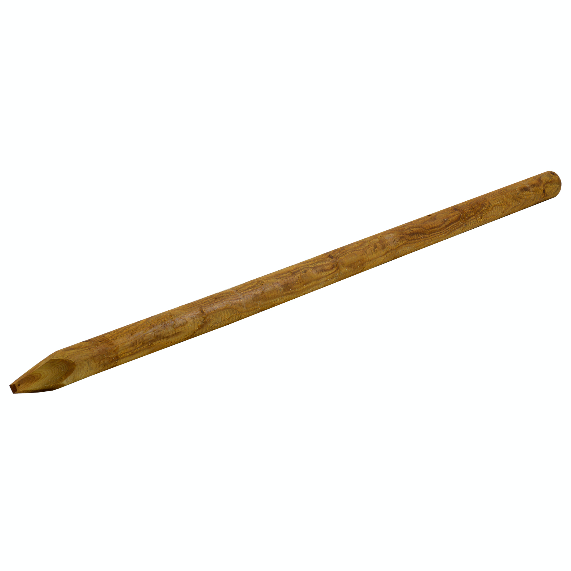 Runt, svarvat trä, vässad och tryckimpregnerad.