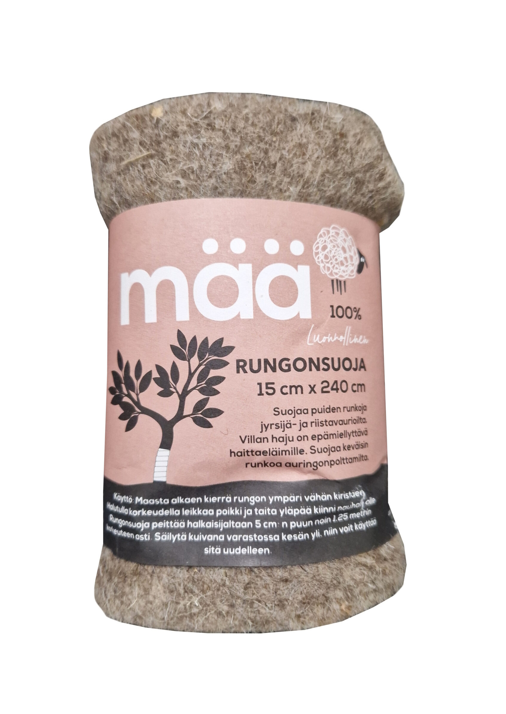 Skyddar trädstammar från skador orsakade av gnagare och vilt. Ullens doft är obehaglig för skadedjur. Skyddar trädstammen mot solbränna på våren.