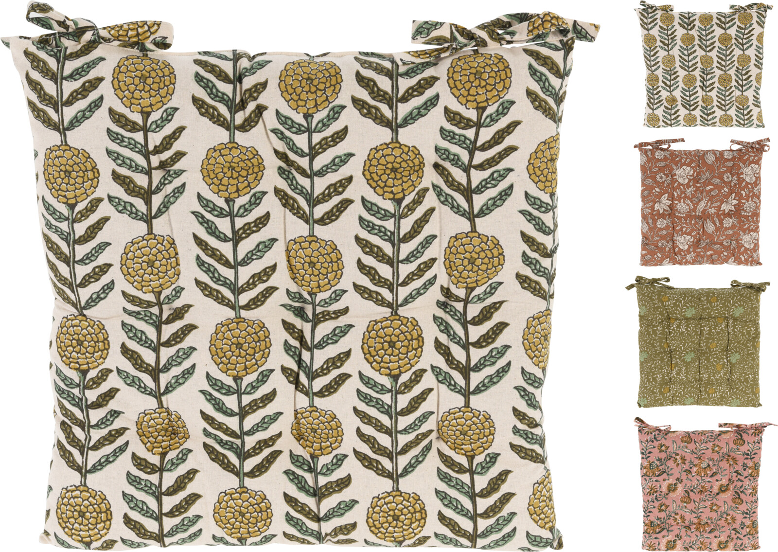 Denna stolsdyna på 40x40 cm är tillverkad av högkvalitativ bomull (Gossypium capsularis) och har ett vackert quiltat blommönster. Nio veck ökar dynans komfort och form, och praktiska band underlättar fästning av dynan på stolen. Finns i fyra olika blomdesigner som lyser upp vilket rum som helst.