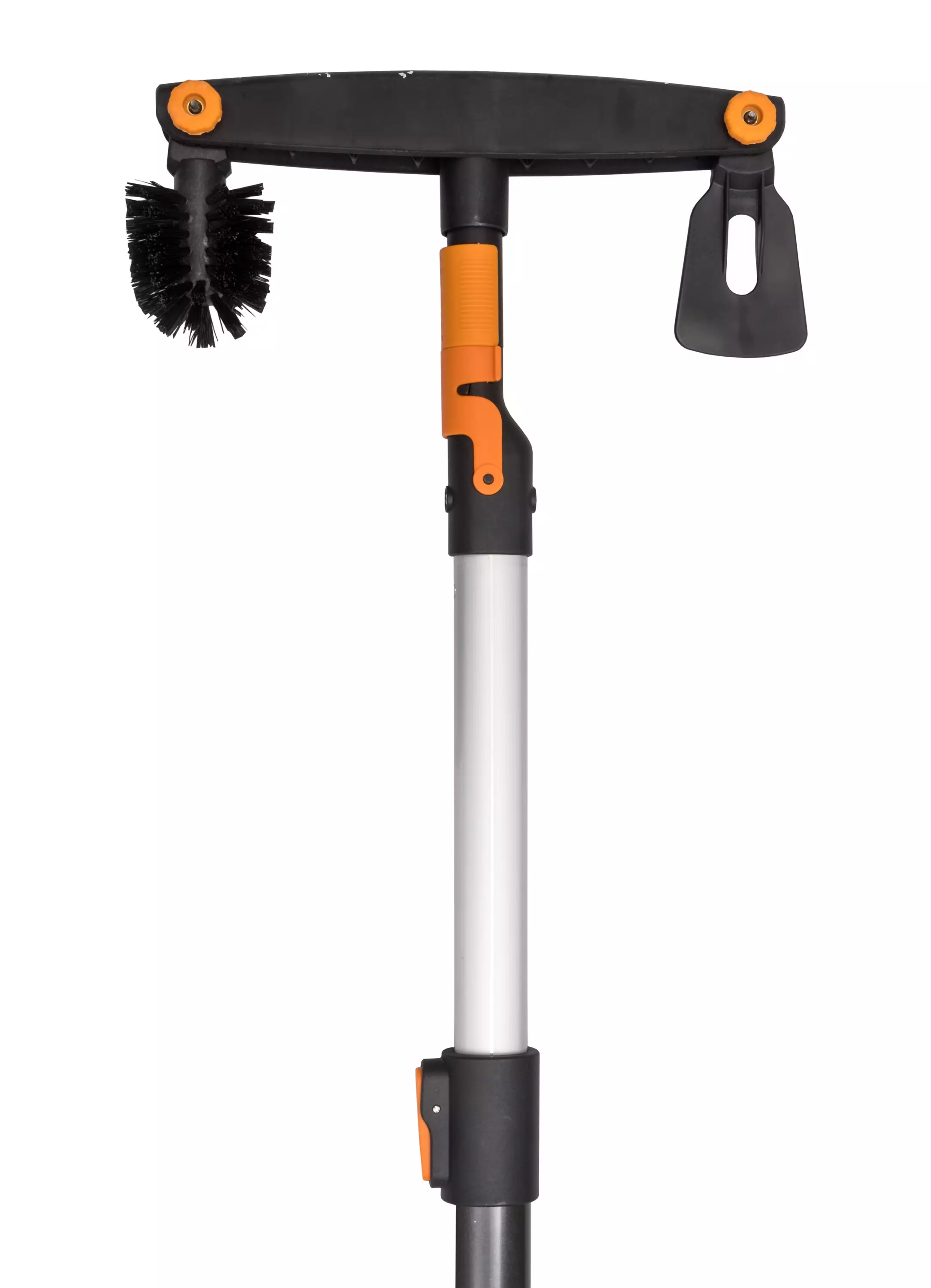 Fiskars QuikFit rännrengöringsborste och skrapa kombination med ett teleskopiskt handtag rengör rännor effektivt. Den optimala arbetsvinkeln kan justeras för båda ändar separat. Skaftet är av lätt aluminium. Handtaget har ett automatiskt lås, med en dubbel spärr som låser handtaget och QuikFit-arbetshuvudet säkert. Jobba säkert från marken!
