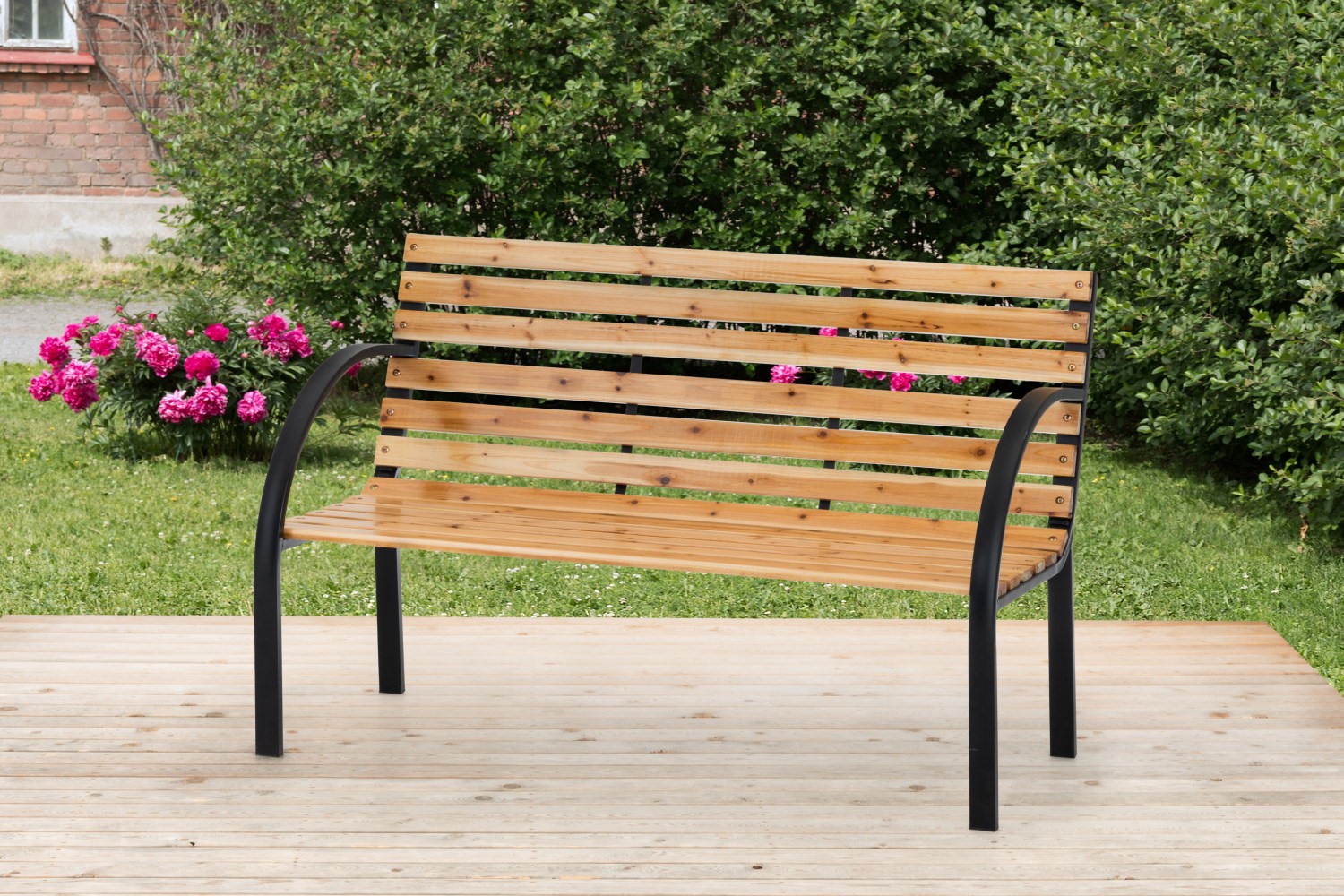 Pulverlackerad stålram, trädelar av gran (12 st 122 x 5,5 x 1,8 cm). Maximal lastkapacitet 150 kg.