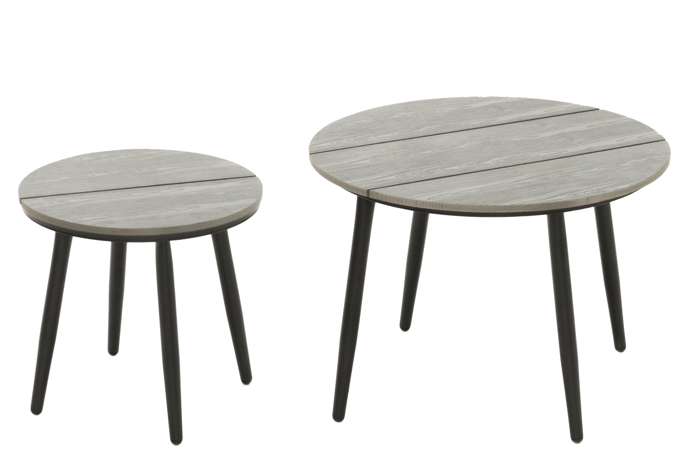 Polywood, som efterliknar träets kornmönster, är ett väderbeständigt material. Ramen och benen på det runda bordet är gjorda av stål. Grå är ett gammalt material som passar alla typer av miljöer. Uppsättningen innehåller två bord.