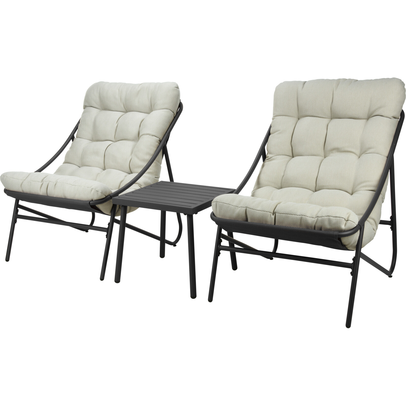 3-delat trädgårdsmöbelset: mysiga stolar och bord, mörkgrå och beige.