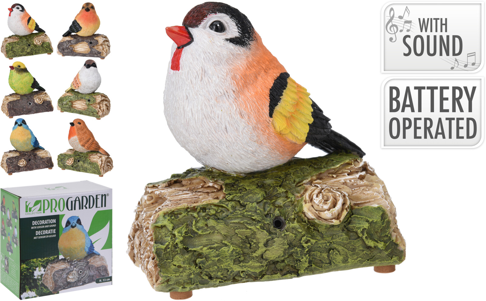För in liv och ljud i din trädgård med denna charmiga sångfågelstaty på en trägren. Denna 14 cm höga staty är gjord av hållbart polystone-material som imiterar naturliga stenar men är lättare och mer väderbeständigt. Statyn finns tillgänglig i sex olika stilar och inkluderar en ljudmekanism som drivs av två AA-batterier (ej inkluderade). Varje staty levereras i en färgglad, designad låda, vilket gör den till en perfekt present för natur- och fågelälskare.