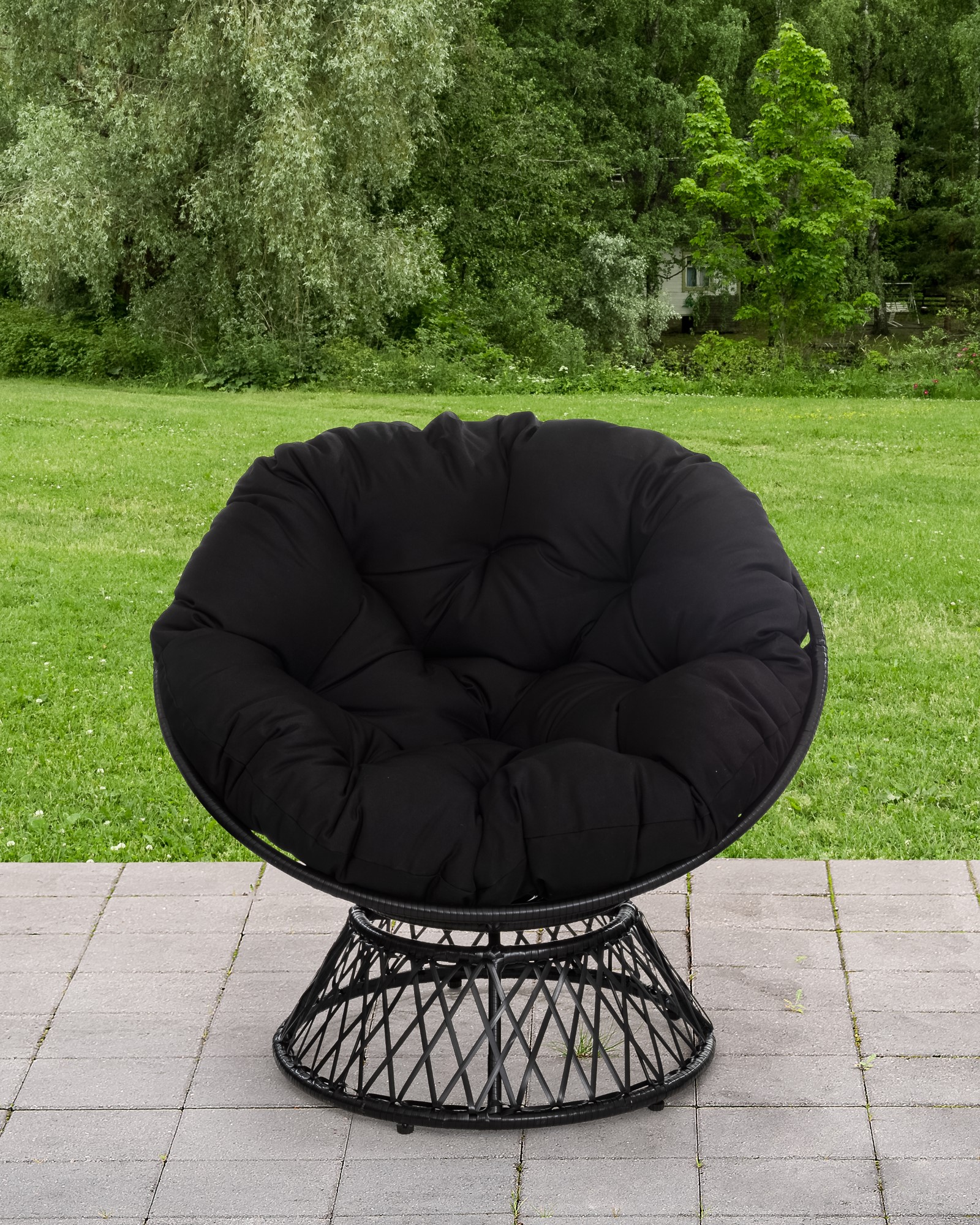 Den underbara runda fåtöljen är gjord av slitstark polyetenfläta. Stolen har en stålram och kommer med en plyschdyna. Det bästa stället på terrassen är i denna stolen!