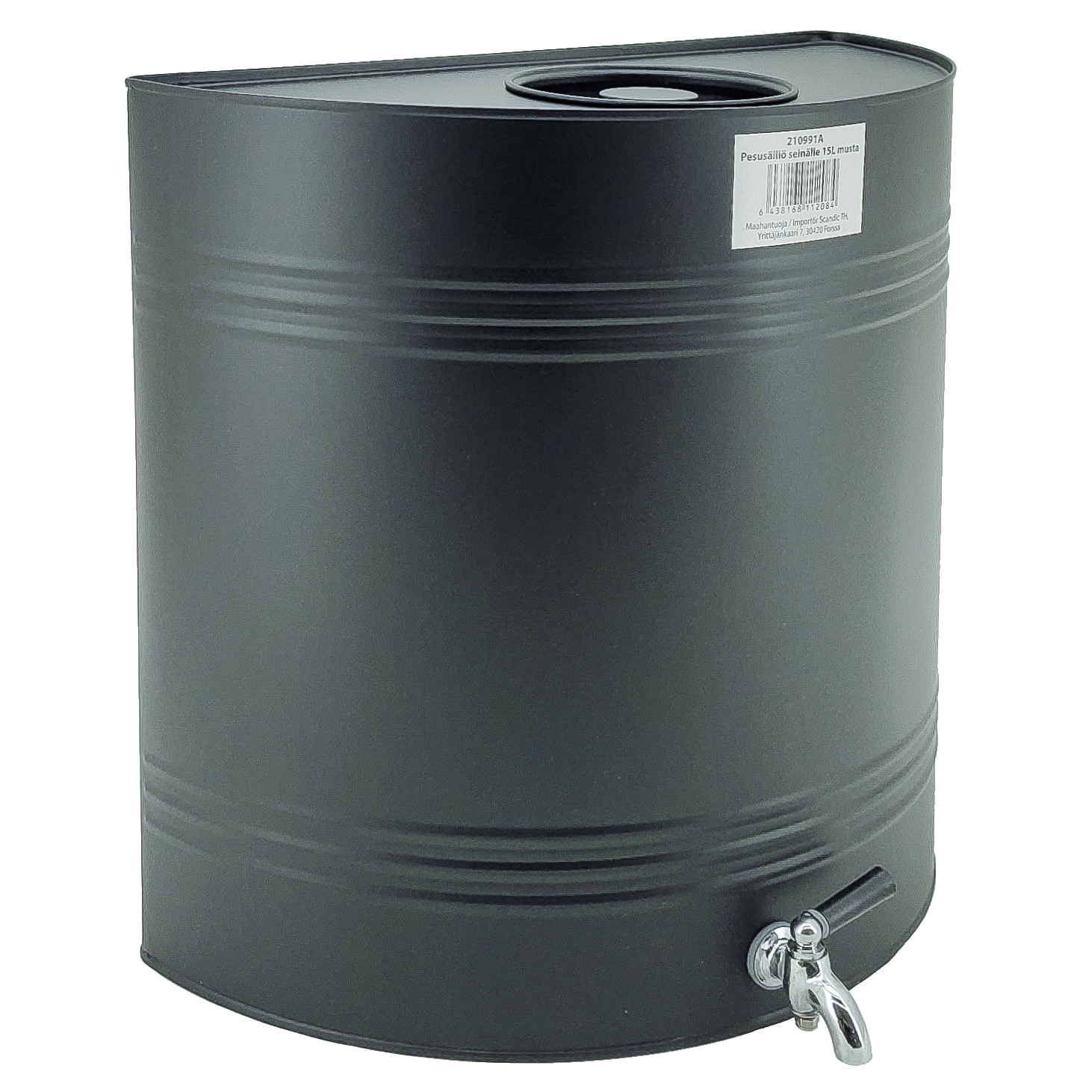 Snygg vattenbehållare till väggen. Snygg, mattsvart och smidig med kran och lock med tätning, skölj enkelt händerna i trädgården.