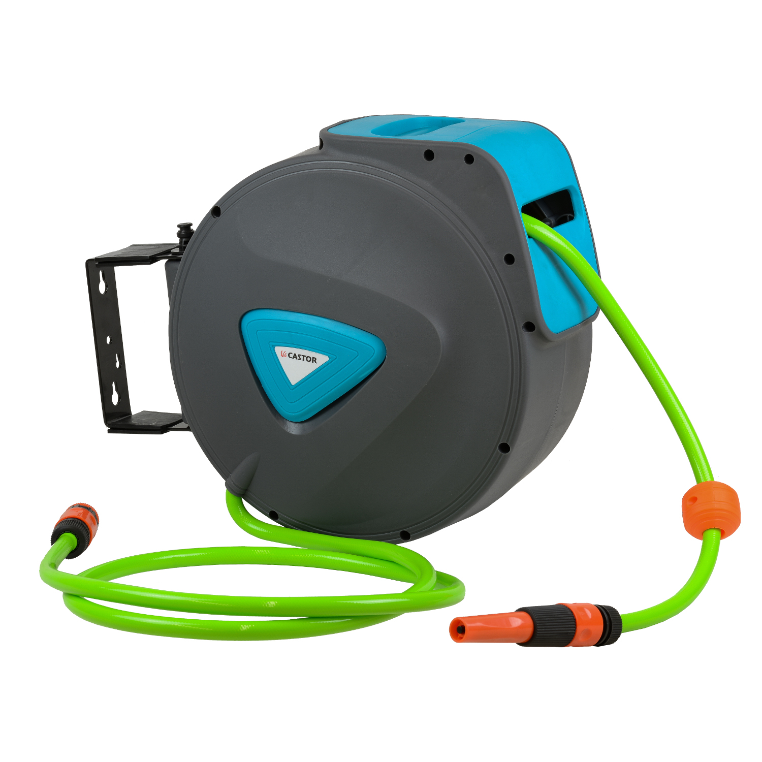 Den praktiska slangvinadan med 20 m trädgådsslang gör det lättare och snabbare att få vatten! Vattenslangens vinda dras in automatiskt.