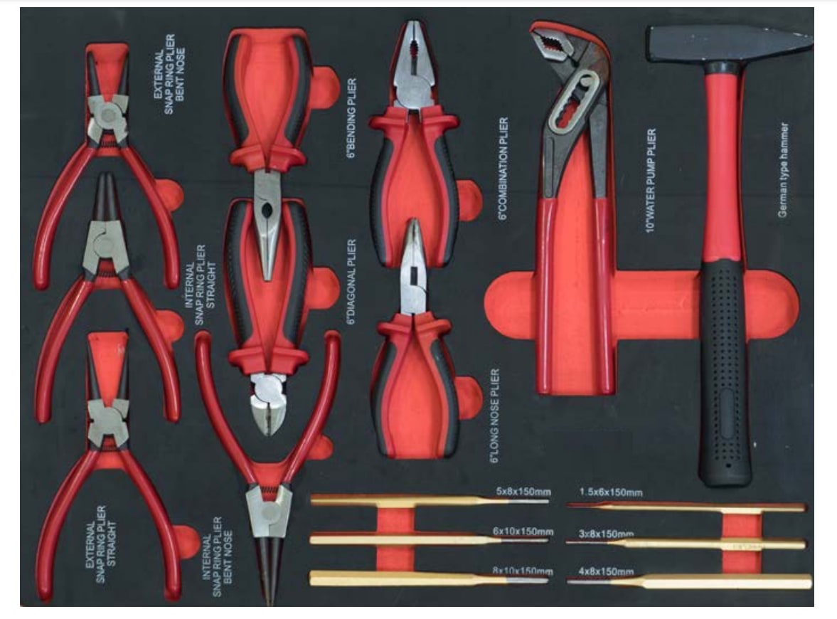 Verktygsset av hög kvalitet inbäddat i skum. Fyller hela lådutrymmet i verktygsvagnen. Var och en har sin egen plats, verktygen förvaras i en prydlig rad för användning.