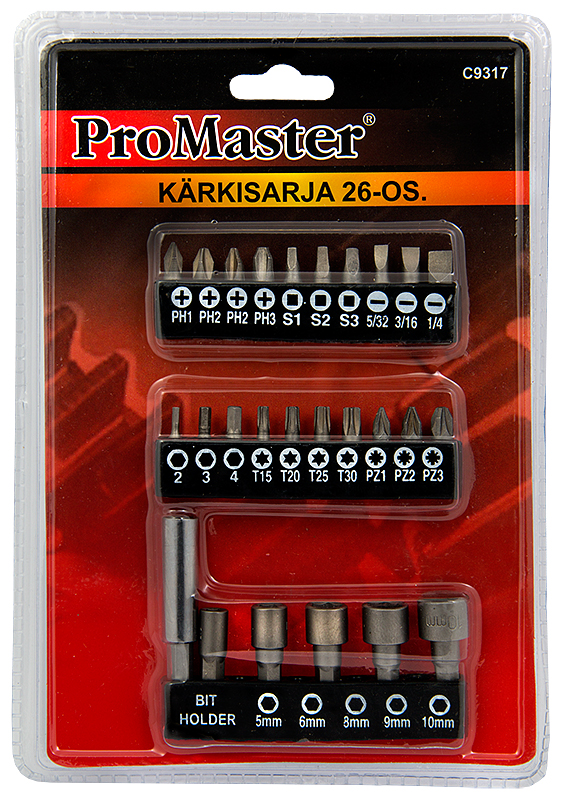 Bitssats 26 delar -material krom-vanadinstål (CrV 6150) -Set med 26 delar inkluderar --3 st slitsade skruvbits: 5/32", 3/16" och 1/4" --3 kvadratiska spetsar: S1, S2 och S3 --4 st Phillips tips: PH1... Läs mer