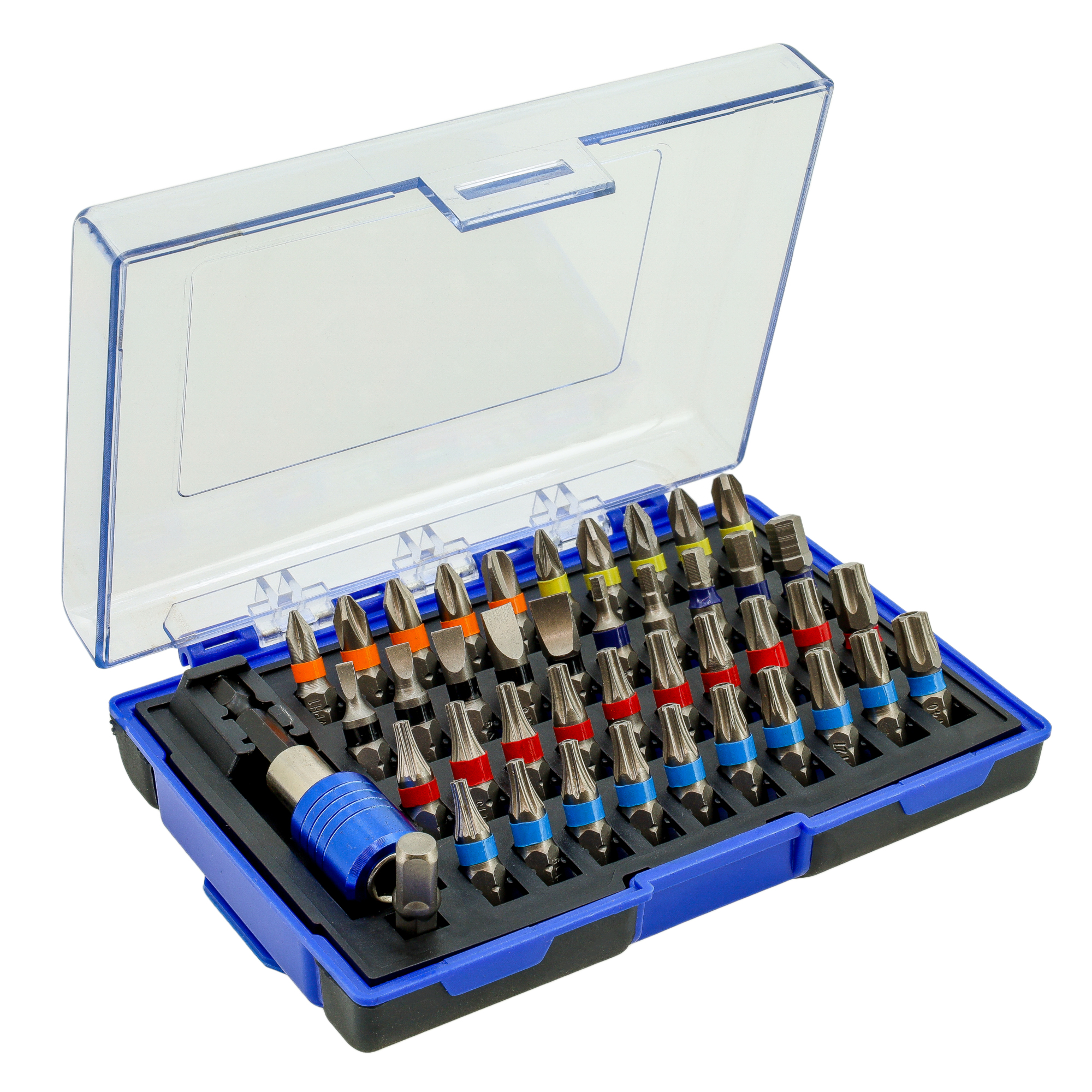 Bits och bitshållare i praktisk förpackning med lock och hängkrok. Perfekt att ha med i verktygslådan. Innehåller alla dem vanligaste bitsen.
