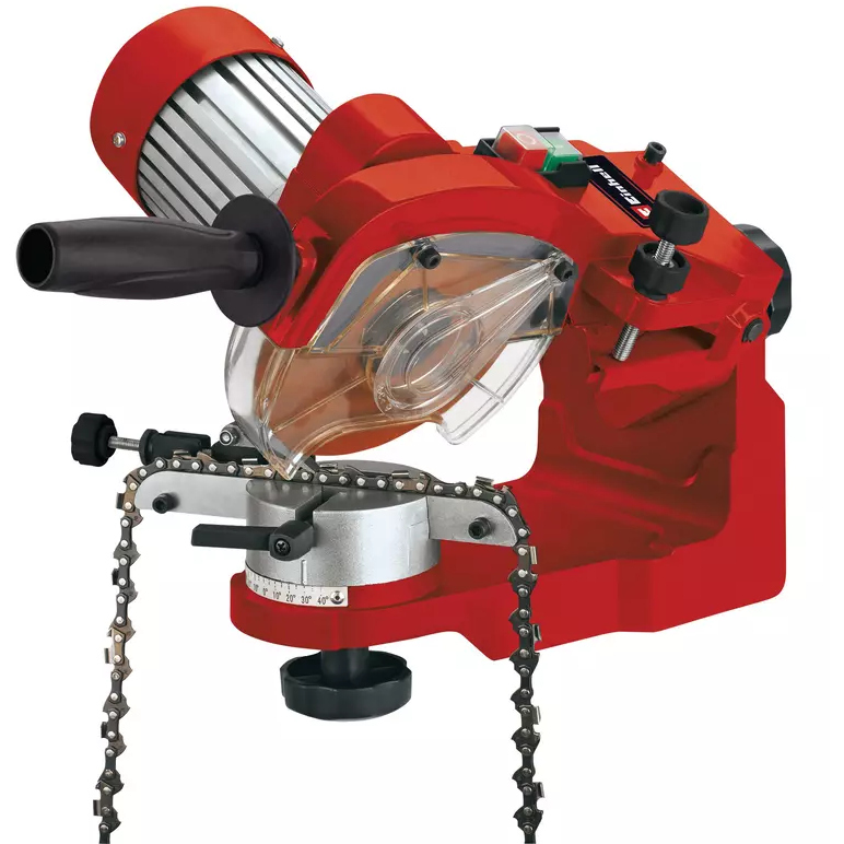 Einhell GC-CS 235 E kedjeslip är en praktisk och robust maskin som passar för precis slipning av alla vanliga sågkedjor. Maskinen är utrustad med ett vridbart spänningsfäste med graderad skala för exakt inställning av slipvinkeln, vilket möjliggör slipning av alla tänder på kedjan utan att behöva spänna om den. Med djupbegränsaren undviks överdriven materialavverkning. Det transparenta skyddsglaset och den inbyggda belysningen säkerställer exakt och säker arbete även under sämre ljusförhållanden.