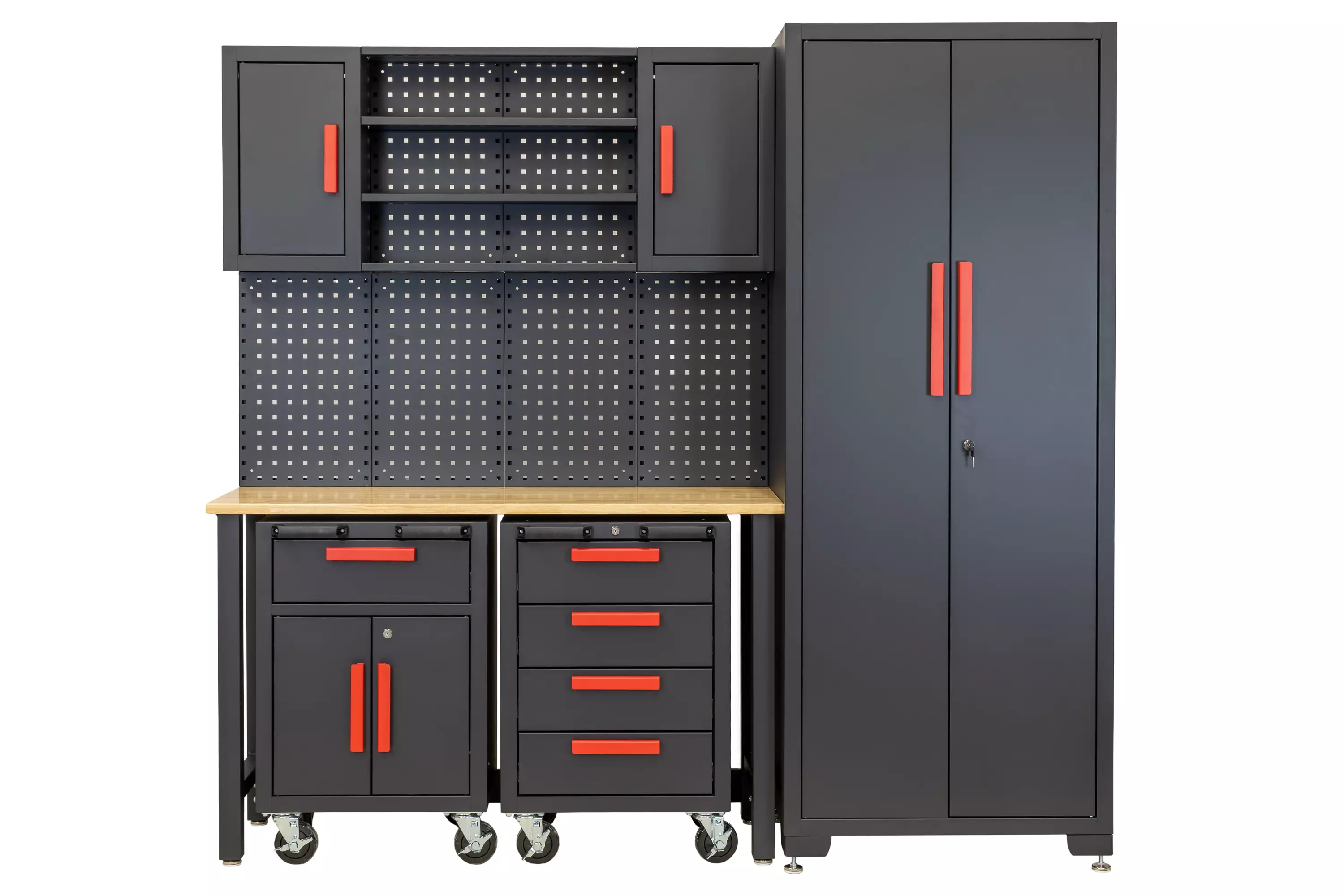 Den perfekta förvaringslösningen för ditt garage eller lager. Snygga svarta stålmöbler med röda handtag. Innehåller: högskåp, verktygsvagn och hurtsenhet, arbetsbänk med massiv träskiva och väggskåp.
