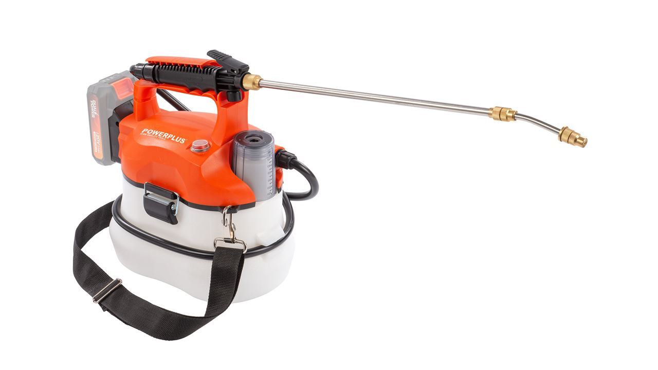Med Powerplus tryckspruta 20V är ogräsbekämpning, desinfektion av stora ytor, vattning och gödsling av växter enkel. Trycksprutan är batteridriven, så pumpning krävs inte för att använda sprutan. Standardtrycket för enheten är 5 bar, flödeshastigheten är 500 ml/min. Arbetskomfort och ergonomi ökas av D-handtaget, bärremmen och låsknappen. Tanken 4 l är gjord av slitstarkt och lätt material.