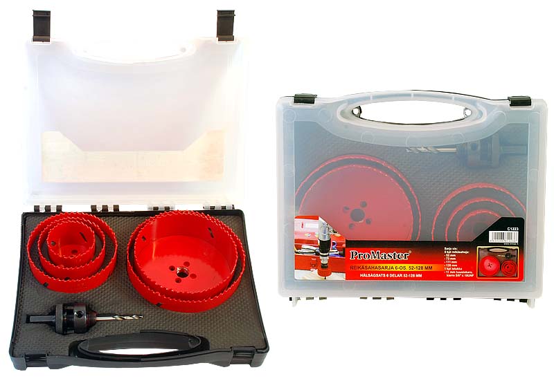 serien innehåller: - 5 st hålsågar: 52, 73, 98, 111 och 128 mm