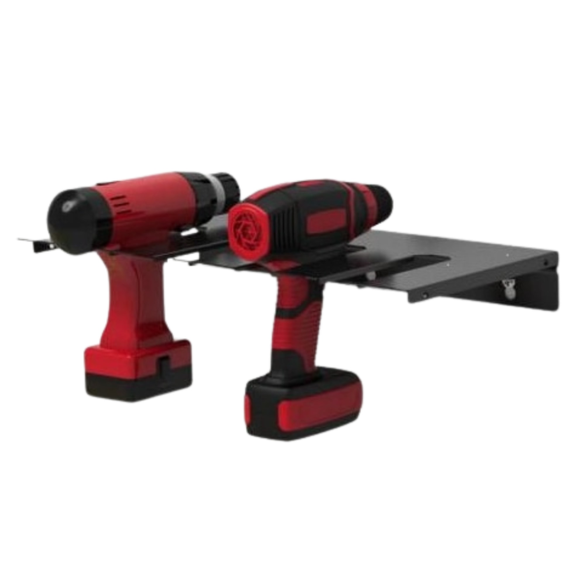 Vägghängd öppen hylla med batterimaskinhållare. Förvaringshylla i stålram för förvaring av alla sladdlösa verktyg och tillbehör.