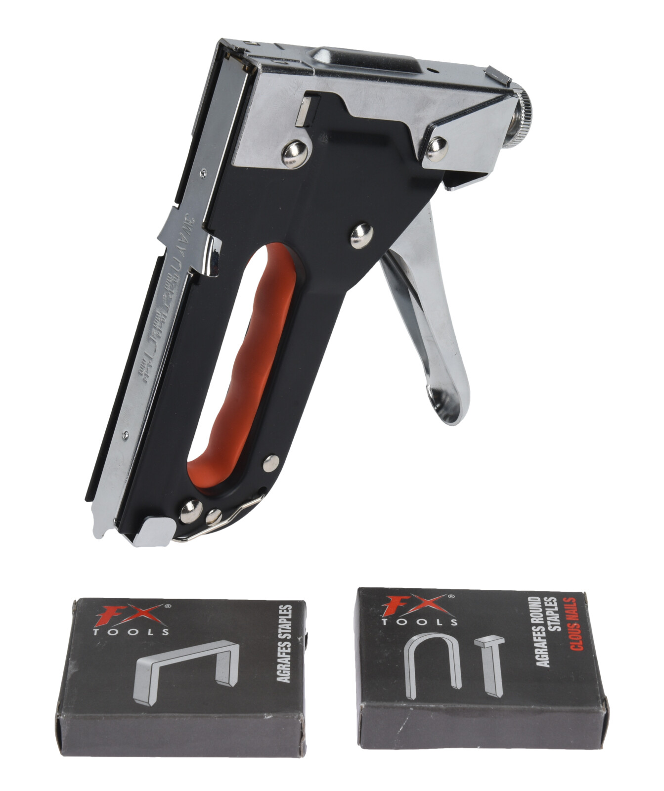 Denna tunga häftapparat i metall levereras med en blandning av häftklamrar och spikar förpackade i två kartonglådor. Häftapparaten kan använda 10-14 mm spikar (20 gram), runda häftklamrar 10-12 mm (30 gram) och rektangulära häftklamrar 10-14 mm (60 gram), vilket säkerställer mångsidig användning på olika material.