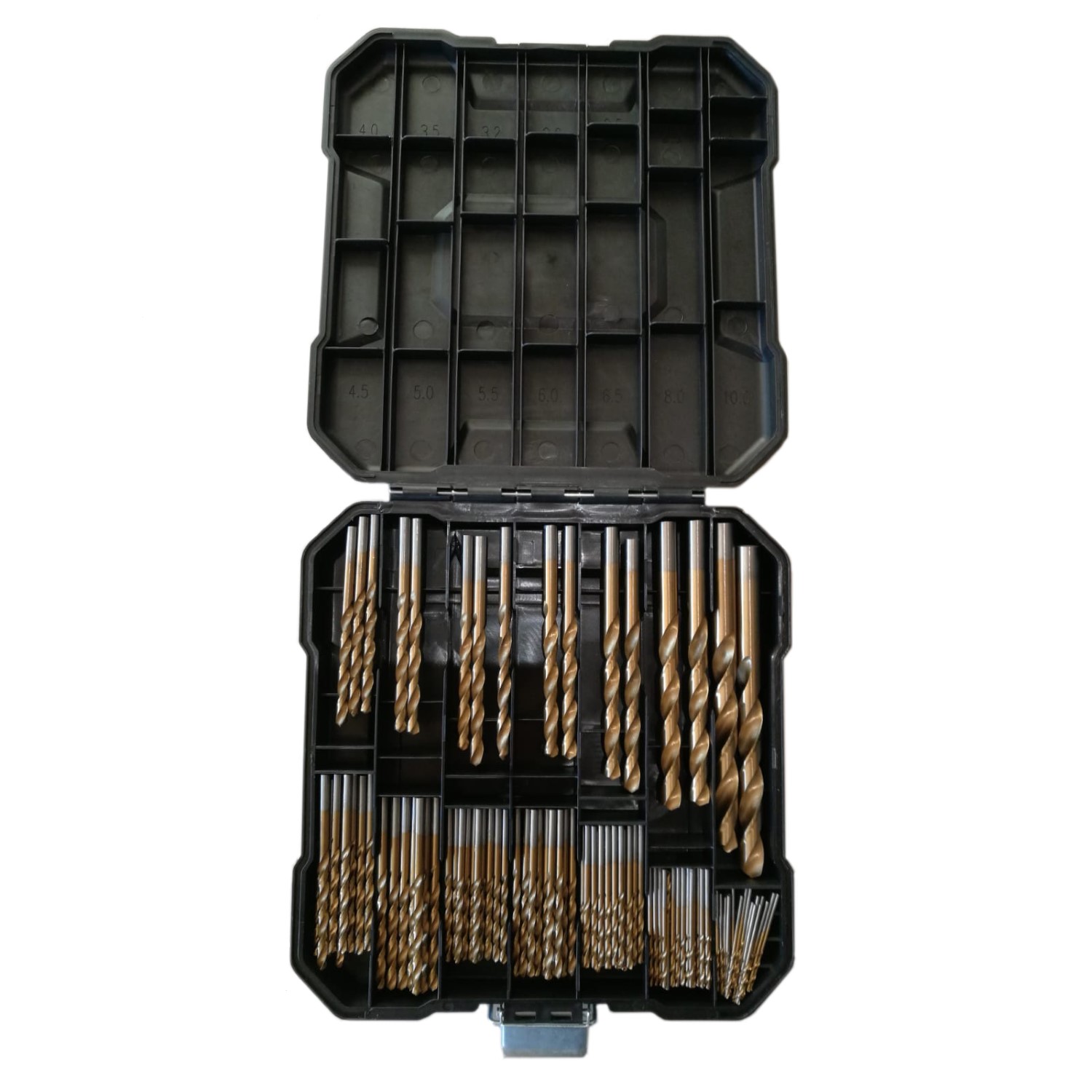 Ett omfattande urval av metallborrar i olika storlekar i en praktisk låda.