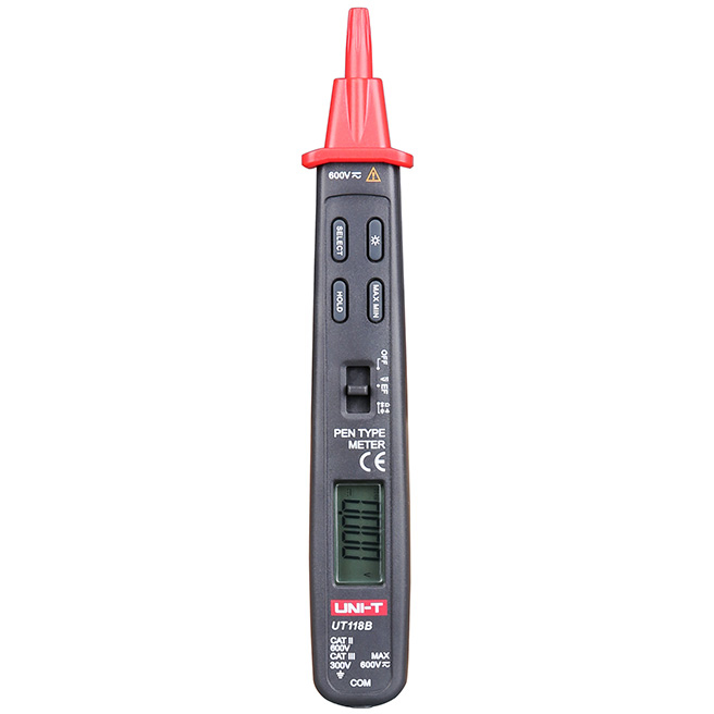 UT118B UNI-T är en praktisk pennformad multimeter som är mångsidig för elektriska mätningar. Den mäter växelspänning, likspänning, ström, motstånd och dioder. Enheten mäter spänningen fyra gånger per sekund och har automatisk spänningsdetektion. Den bakgrundsbelysta displayen och automatisk avstängning efter 10 minuter gör enheten användarvänlig och energibesparande. Multimeterns lågspänningsindikator hjälper till att undvika avbrott i användningen.
