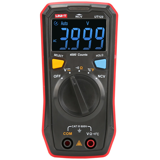 UT123 är en fickstor multimeter designad för hemmabruk, med EBTN-skärm och bakgrundsbelysning som möjliggör avläsning av mätresultat även i mörker.