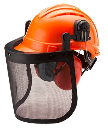 Skyddshjälm med visir och hörselskydd. Justerbart fäste, slitstarkt material och CE-EN godkännd.