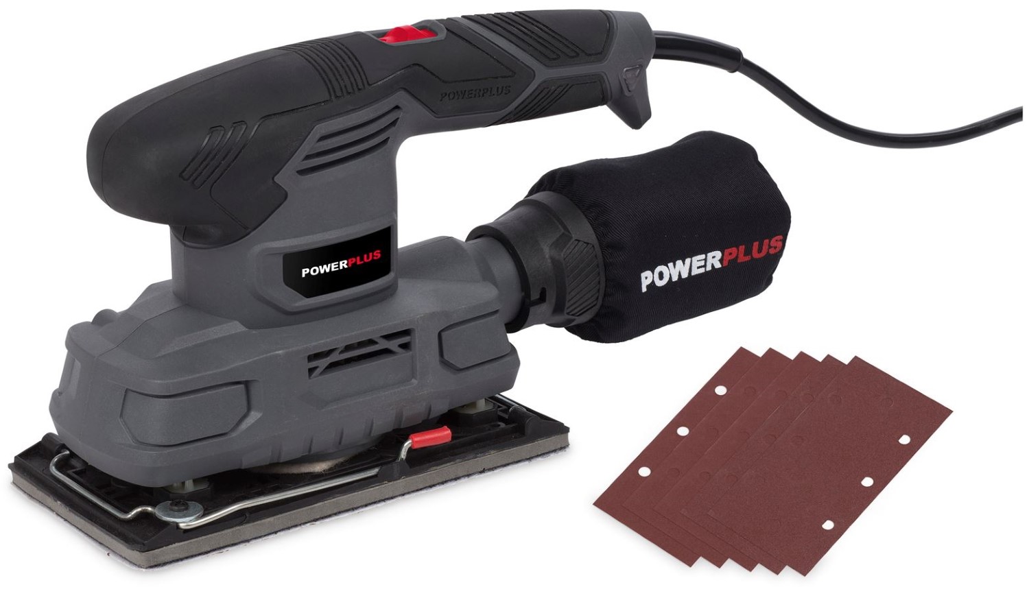POWE40010 har ett ergonomiskt handtag för bekväm användning och en självdammande funktion som förbättrar sikten på slipytan och en renare arbetsmiljö. Två G80, två G120 och ett G240 sandpapper ingår.
