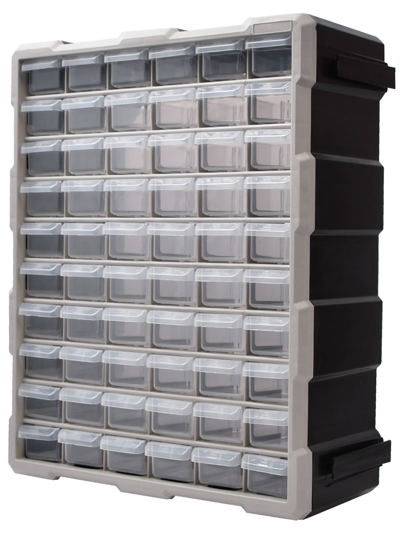Det finns 60 separata 11 x 5 cm klara lådor i lådan.