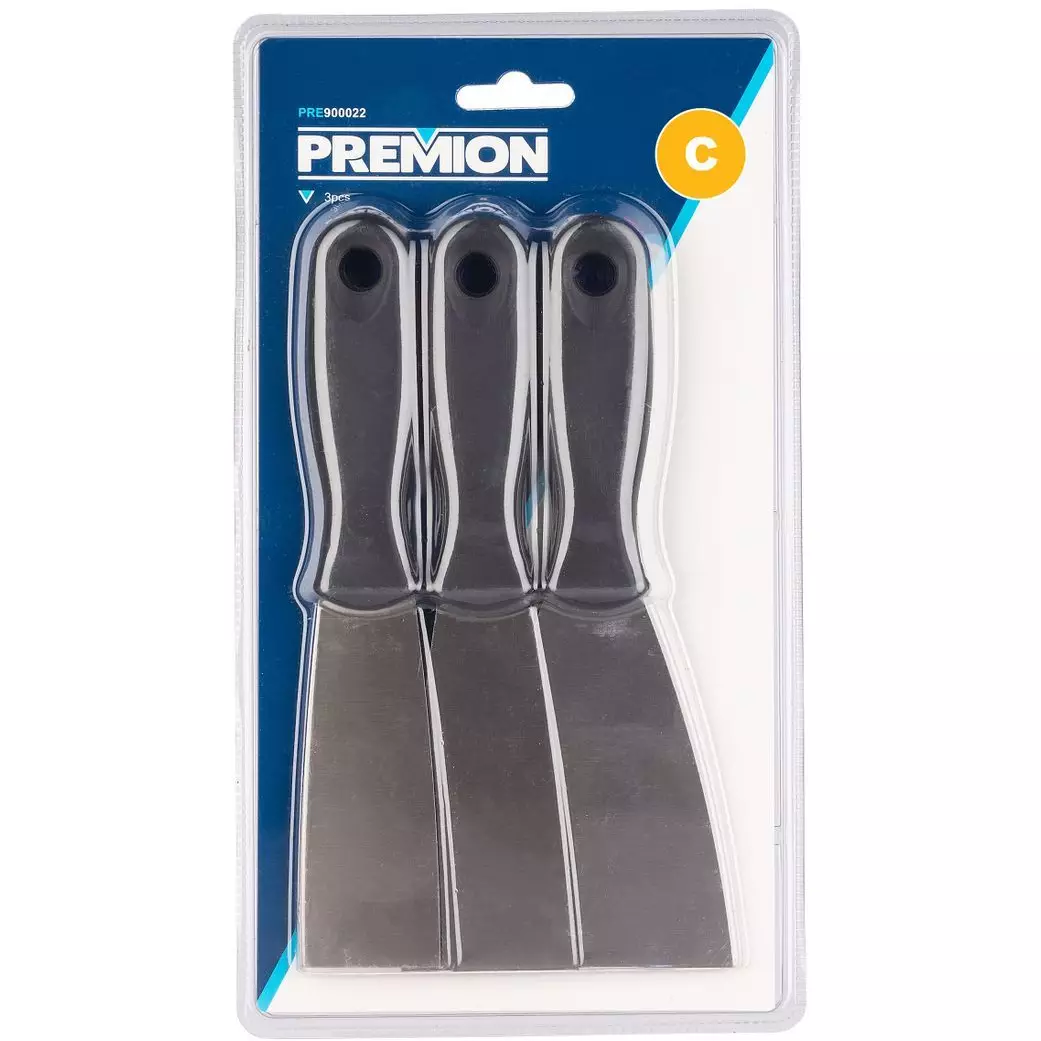 Premion 3-delars kittsats erbjuder kvalitativa och hållbara spacklar för diverse arbeten, utrustade med bekväma plasthandtag och upphängningshål.