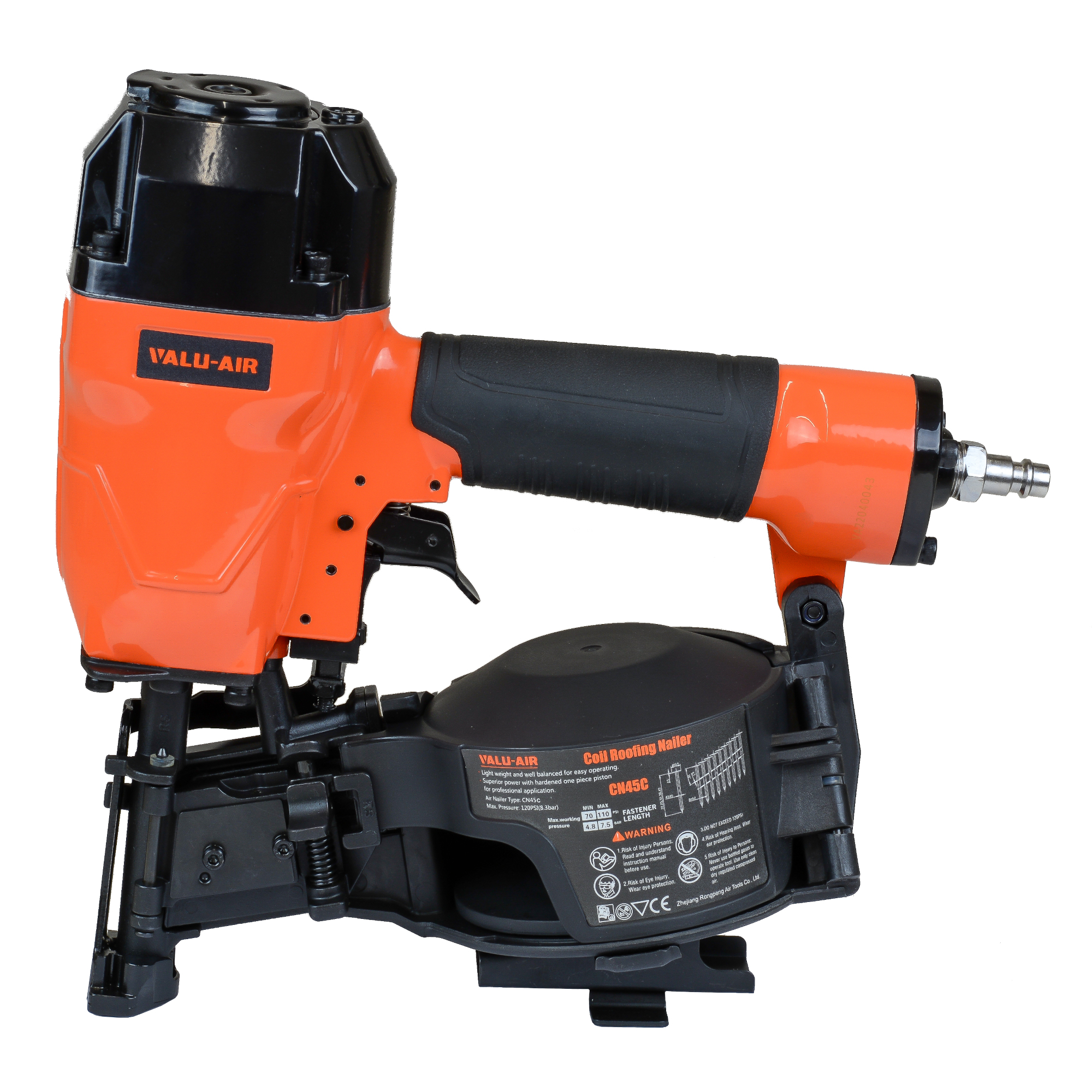 Spikpistol Valu-Air 15° Rundbandad Egenskaper: Spiklängd: 19-45 mm Arbetstryck: 4.8-7,5 bar Maxtryck: 8.3 bar Luftintag: 1/4" Dimension: 295 x 279 x 58 mm Vikt: 2.59 kg