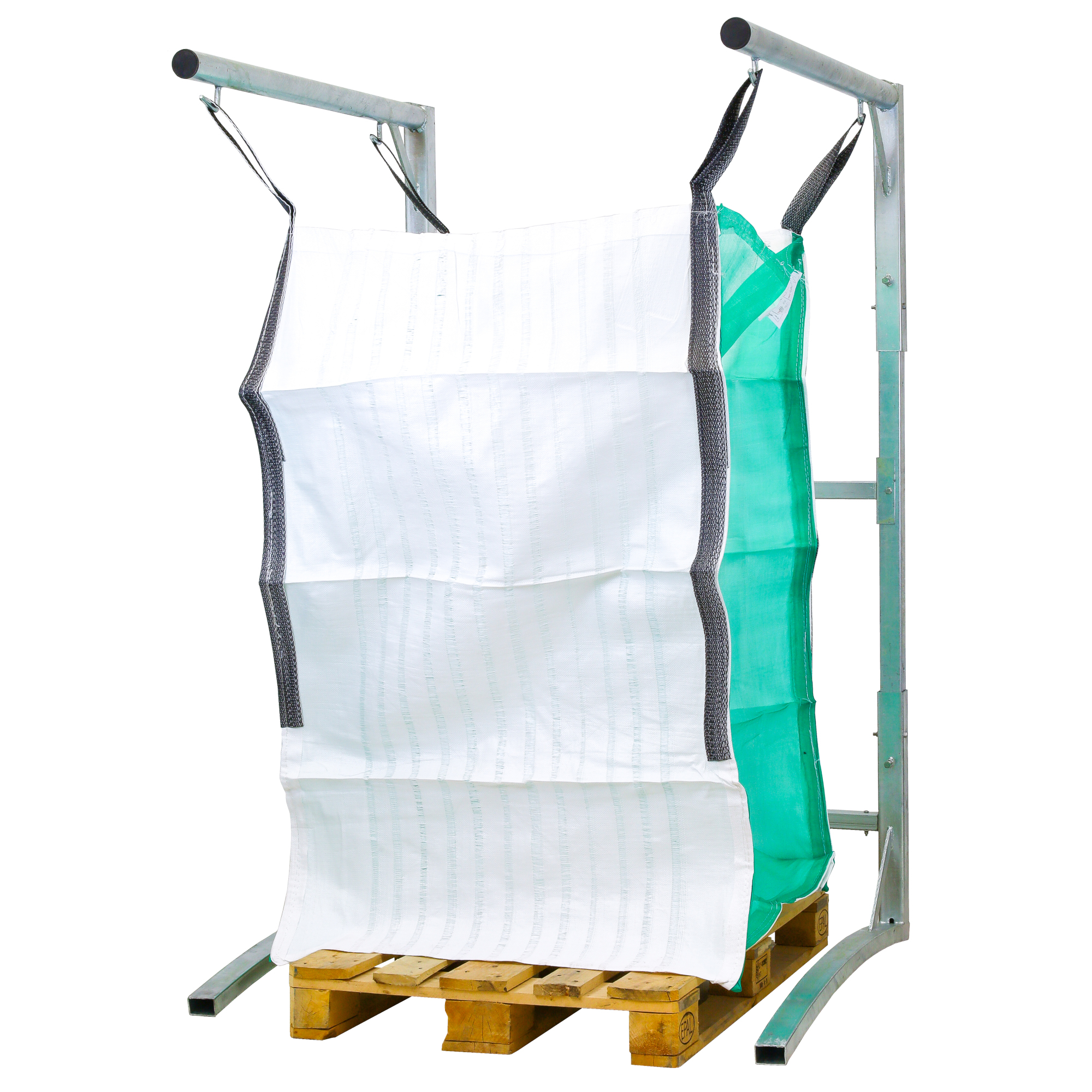 Högkvalitativt, helgalvaniserat ställ för vedsäck. Stället påskyndar hanteringen av veden och säckar. Stället har krokar som gör det enkelt att ta bort säcken från ställningen.