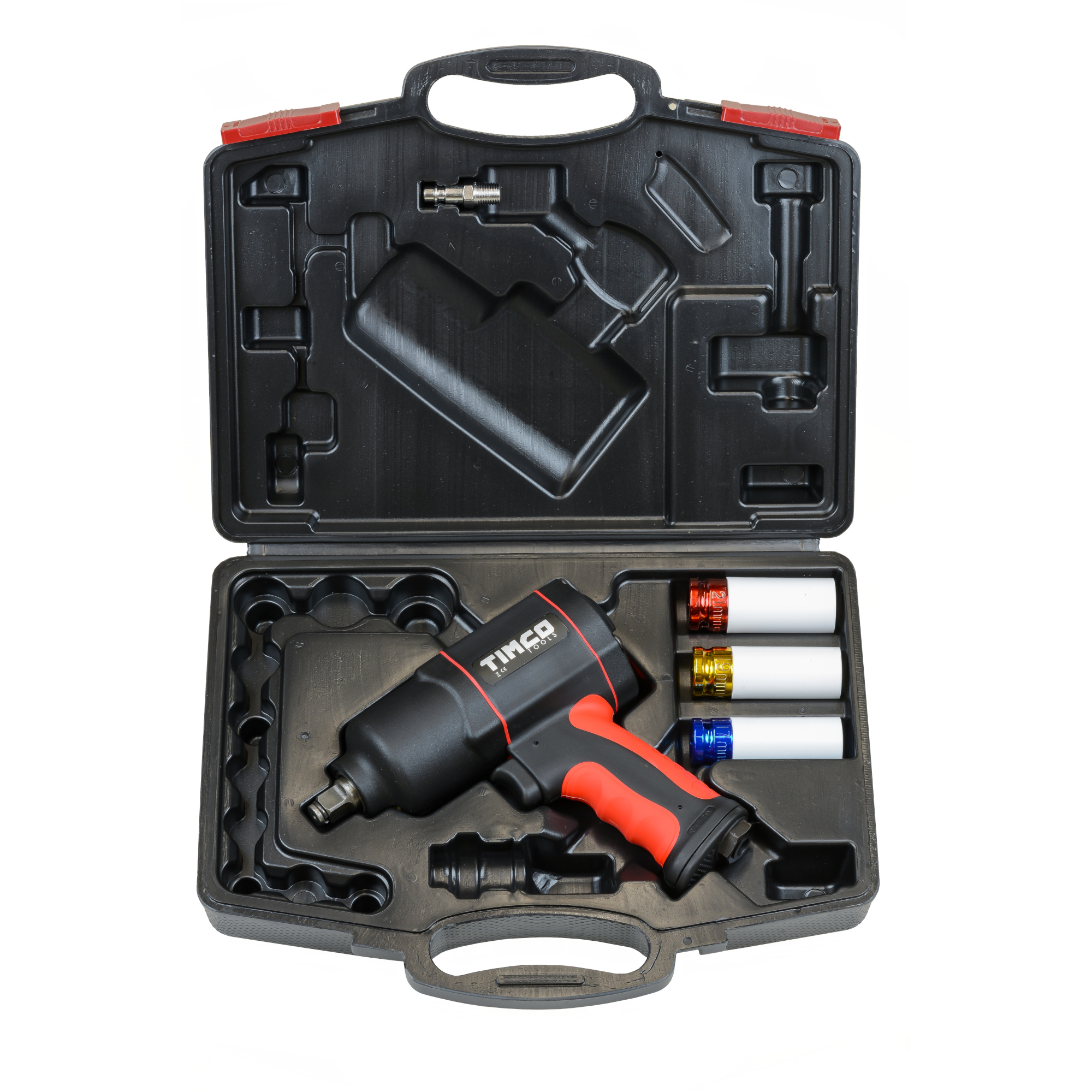 Kraftfull, pneumatisk mutterdragare för allmänt bruk. Denna mutterdragare av hög kvalitet har en lätt och hållbar kompositstruktur och dubbla hammare. Mutterdragaren är 185 mm lång och CE-standardiserad. Levereras i en praktisk låda med tre krafthylsor: 17, 19, och 21 mm.