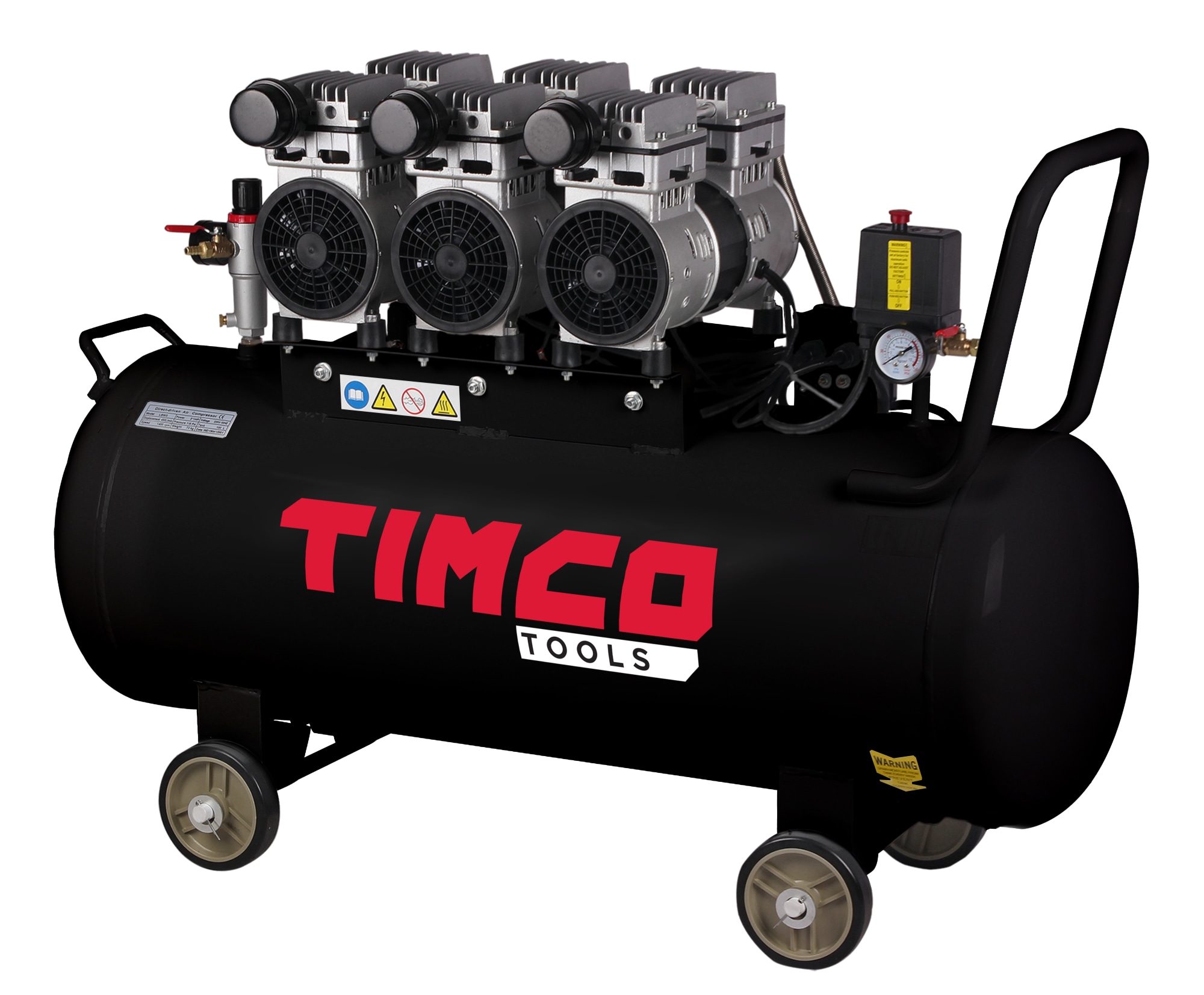 Timco underhållsfri oljefri kompressor med 100 liters tank. Tre tysta 750 W oljefria kolvkompressorer producerar totalt 324 liter per minut. Max tryck 8 bar. Det finns många användningsområden, som platser där man inte vill ha störande ljud och inga oljerester får komma ut i luften.