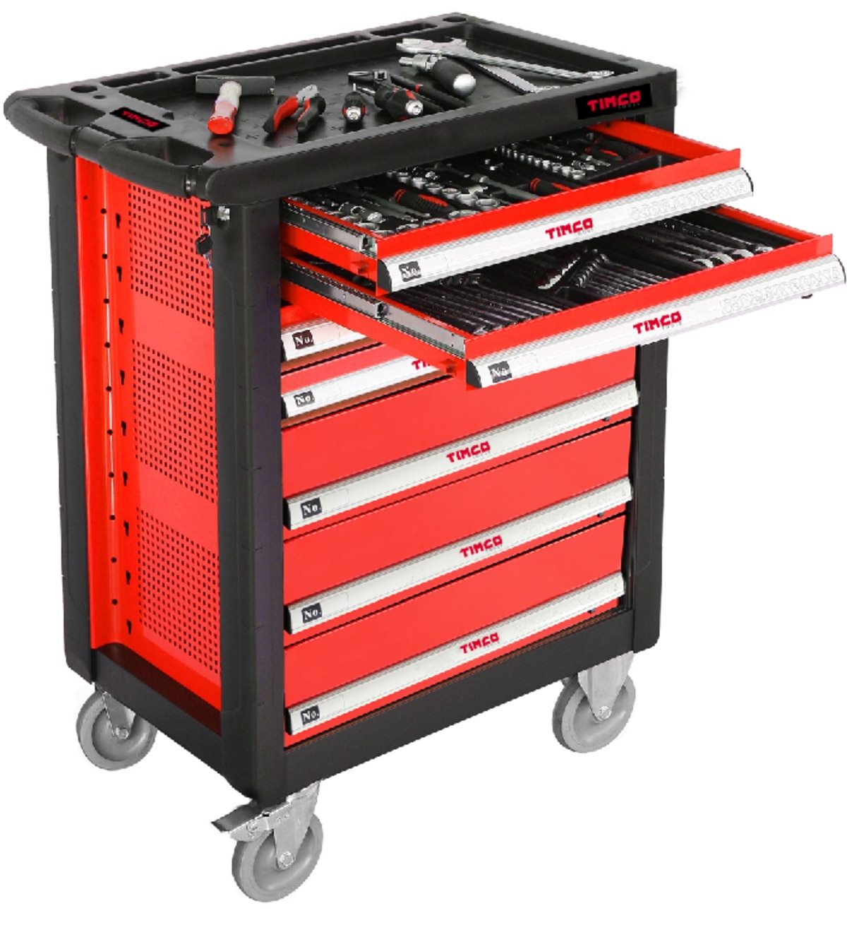 Timco verktygsvagn är ett högkvalitativt och mångsidigt val. Verktygsvagnen innehåller ett 221-delat omfattande urval av hållbara och moderna verktyg, som var och en har sin egen plats. Verktygsvagnen har utmärkta rullande hjul under sig, vilket gör att flytta verktygsvagnen lätt och lätt. Två av hjulen är låsbara, så även verktygsvagnen sitter säkert på plats.